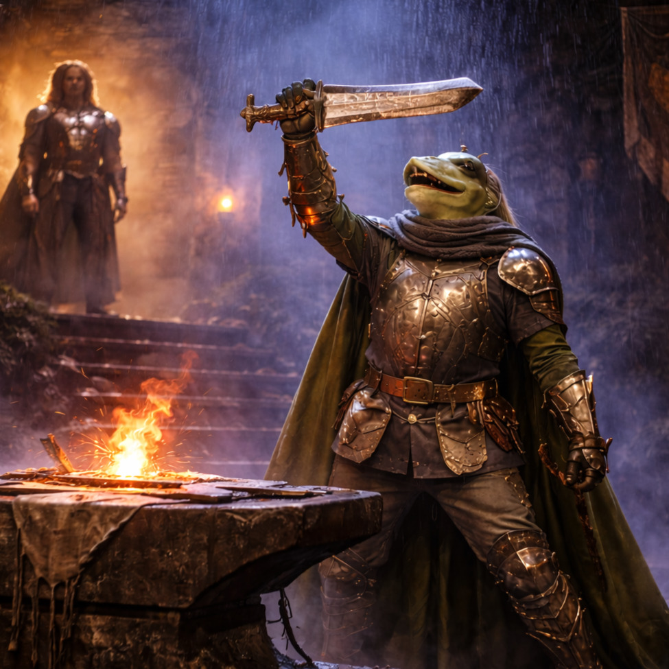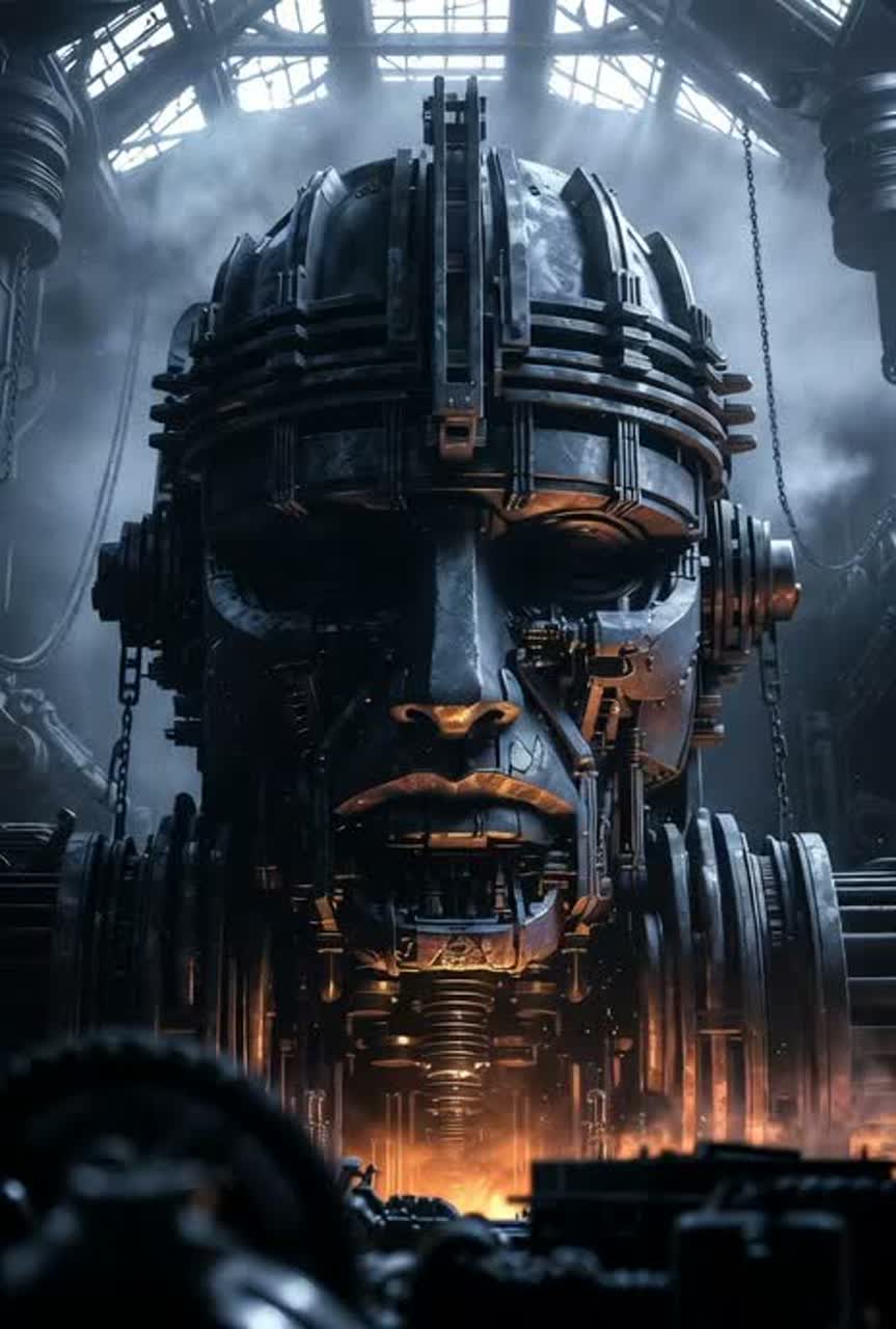 [intro: distant machine rumble and sub-drone bed, sparse air hiss, single hammer strike with long tail, slow camera-pan vibe]