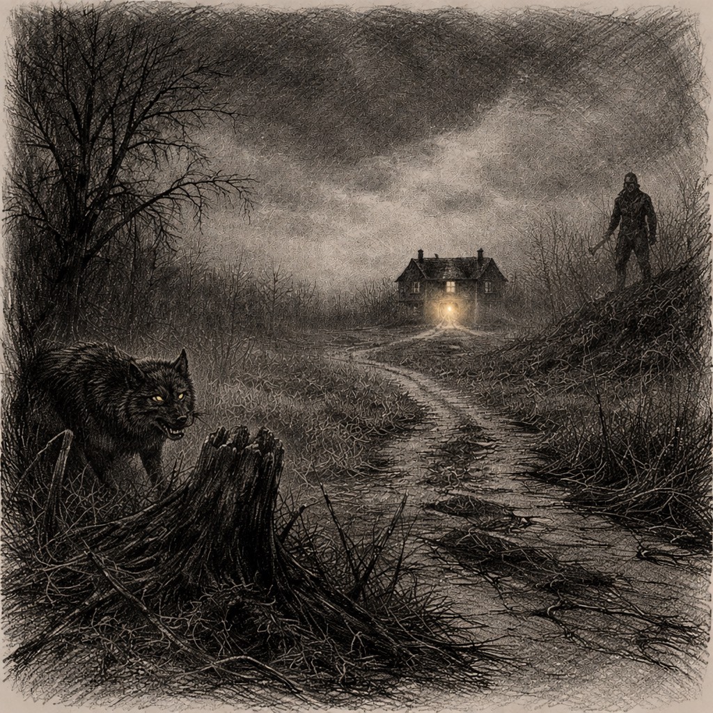 [Instrumentation: Distorted vintage calliope organ through tape saturation and cavernous reverb for warped carnival vibes, dense analog synth pads evoking impenetrable fog, pulsing sub-bass mimicking a paranoid heartbeat, field recordings of rain on mud and creaking metal, sparse detuned acoustic guitar plucks for folk horror contrast, electronic stutters and glitches for mental fractures]