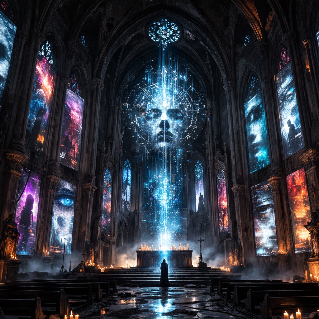 [Instrumentation: Ethereal synth pads and shimmering digital bells, crushing 7-string guitars with heavy distortion and modulation pedals, hybrid percussion (massive taiko + electronic triggers + orchestral hits + punishing double-kick), cinematic string and brass sections via powerful synths, deep pulsating sub-bass, glitch artifacts and digital distortion for cyberpunk edge, ]