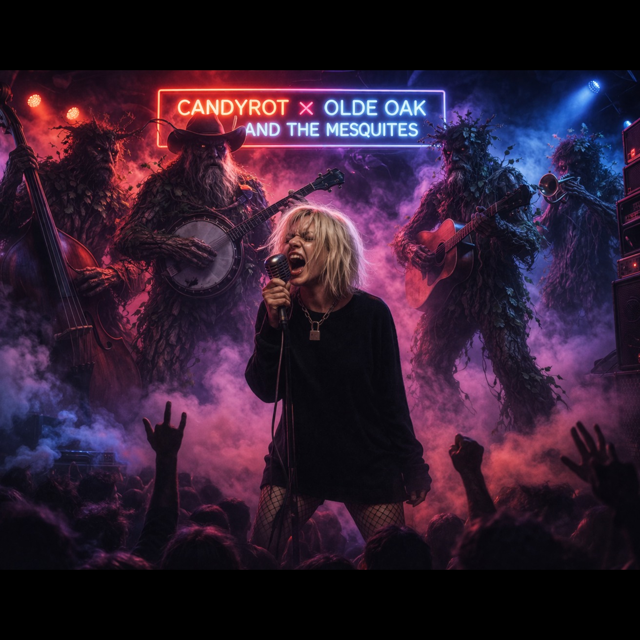 instrumentation: "driving acoustic guitar, fast-picked banjo, punchy kick/snare and handclaps; blended with chainsaw-distorted guitars, sub bass, bit-crushed double-kick hits, rhythmic noise textures"