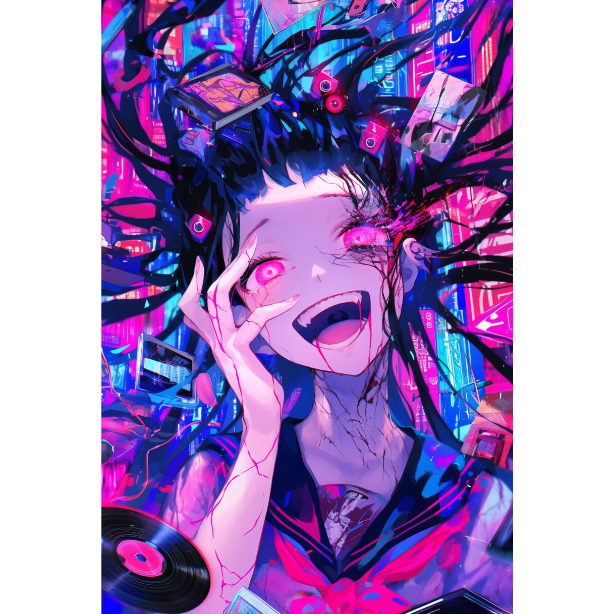 Fast Funk × Glitch Pop × Neo Cyber Rock, BPM175, energetic and surreal, sharp slap bass, bright funky electric guitar, metallic percussions, hyperactive drums, sparkling glitch synths, random chopped vocal samples, rhythmic digital stutters, sudden tempo jumps, colorful electronic layers, groovy but chaotic rhythm, distorted beat transitions, vibrant sound design like a neon carnival spinning out of control, expressive low female vocal with husky tone, alternating whispers and shouts, dynamic stereo field, mix of cute and dark, playful and emotional, echo effects, pulsing bassline, unpredictable rhythm fills, ending fades into layered vocal echoes, cinematic and addictive, evokes feeling of fun confusion and colorful collapse, inspired by hyper J-pop and modern rock fusion, overall mood: explosive, eccentric, stylish, and high-voltage