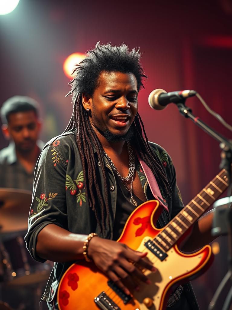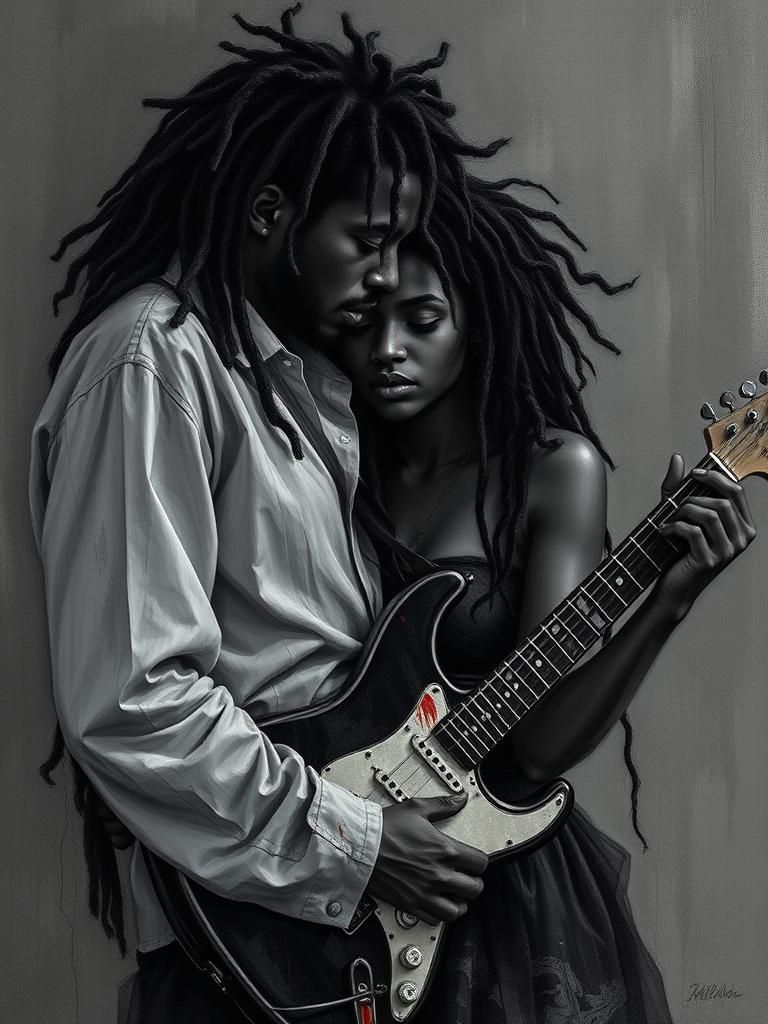 mid-tempo reggae hard riddim rock in 4/4 centered on G minor pentatonic tonality, Palm-muted ostinato built on low G with ♭3 motion (G–B♭–F inflection), emphasizing root–♭3–♭7 contour, Power-chord voicings (G5 to C5) articulate I–IV movement with parallel fifths, Bridge employs ascending parallel dyads with slide articulations (3–5 to 5–7 positions), sustaining quartal tension, Post-chorus resolves via natural harmonics, sparse texture, dynamic decrescendo, solo omitted