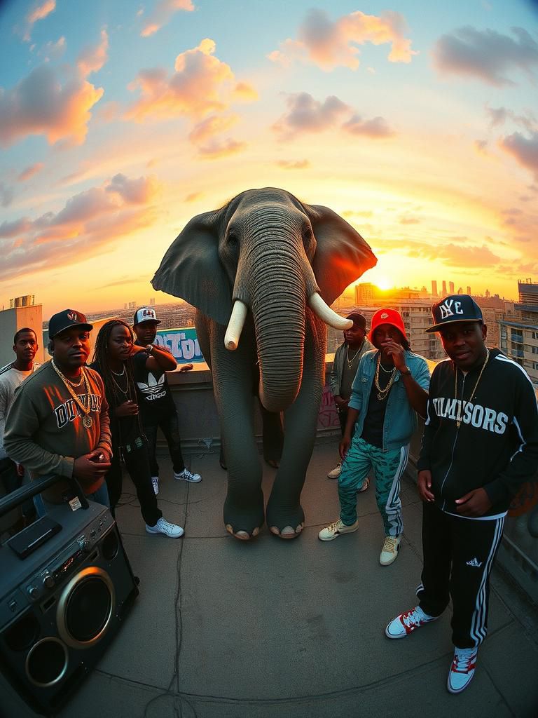 early 1980s reggae riddim Jamaican patois, hip hop block party scene, urban rooftop at sunset, vintage boomboxes, breakdancers mid-spin, graffiti-covered walls, old-school rappers in Kangol hats, gold chains, Adidas tracksuits, mic in hand, expressive body language, vibrant city backdrop, warm analog lighting, fisheye lens style, film grain, raw street energy, pioneers of rap aesthetic, Grandmaster Flash vibe, Sugarhill Gang inspiration, crowd vibing to rhythm, vinyl turntables, cardboard dance mats, authentic 80s hip hop fashion, timeless Bronx attitude, saturated retro color palette, dynamic composition, freeze-frame motion, low-angle shots, exaggerated poses, dramatic flare, VHS texture overlay