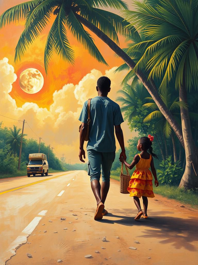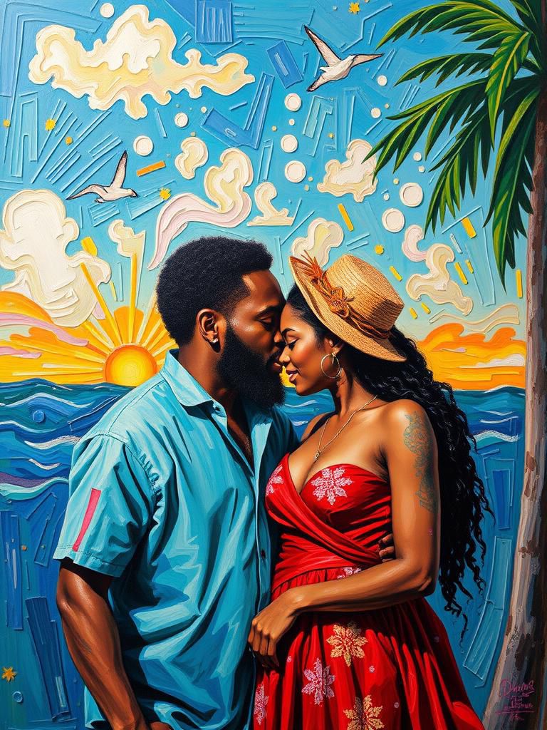 Antique pre-war phonograph twisted by age, shellac cracked, motor stuttering, Sun-soaked patois reggae with 1950s twist‑and‑shout energy, Mid-tempo one-drop drums, fat warm bass, rough offbeat guitars, vintage organ, subtle vinyl crackle, Playful horns, call-and-response vocals, laughter, handclaps, foot stomps, Barefoot backyard vibe, cruising with your love, sunshine after rain, simple joyful groove—ragged, happy, and irresistible under a bright Caribbean sky