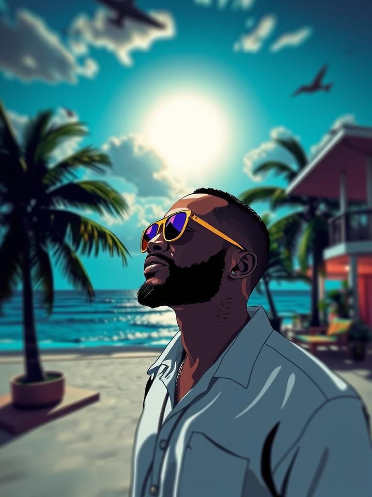 Smiling softly through scars under fading Caribbean sun