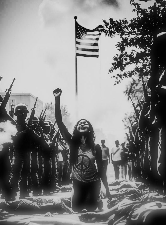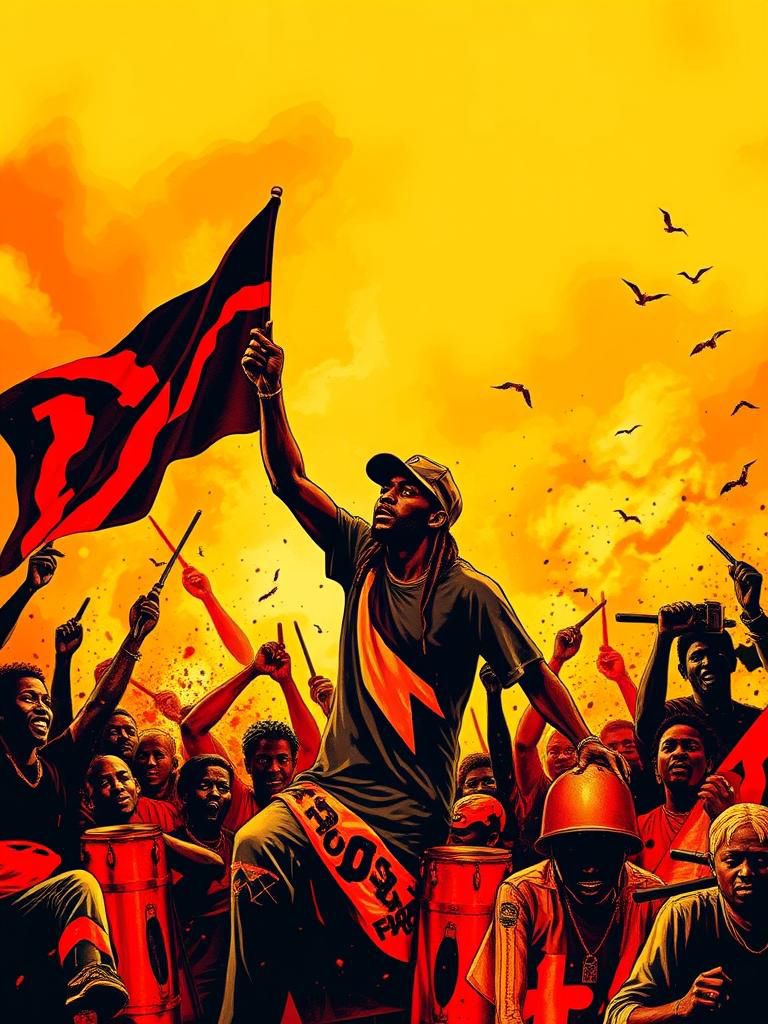 Militant, high-tempo reggae riddim built for confrontation, Bass is overdriven and forceful, rolling like armored movement through concrete streets, Drums strike with urgency—sharp snares, fast kick patterns, aggressive off-beat pressure pushing constant momentum, Horns cut in short, violent bursts, more like shouted commands than melodies, Synth layers hover dark and unstable, soaked in space, sliding in and out with tension, Vocals are barked and chanted—gravel-throated authority mixed with rapid-fire toasting and call-outs, Breaks collapse into pure low-end pressure, accented by distant sirens, gunshots, and radio noise, Atmosphere is hostile, revolutionary, urban, and cinematic, Subtle layers of crowds, footsteps, metal impacts, and street chaos reinforce unrest, Energy builds through looping warlike motifs, accelerating rhythms, and degrading delay, Track fades in echoes and wounded brass, unresolved, still advancing
