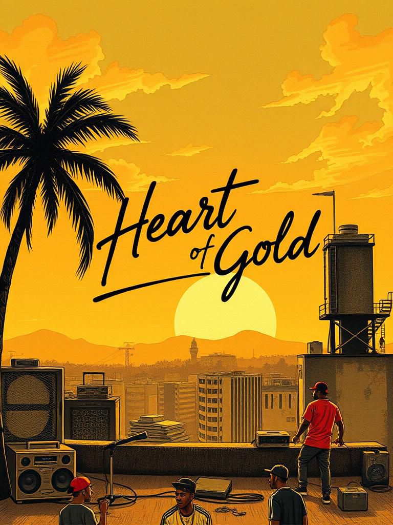 Hardcore gangster reggae riddim fused with early ’80s urban hip hop, Heavy, distorted bass hits like a hammer over slow, punchy, syncopated drums with menacing swing, Horn stabs cut sporadic and sharp; dark, reverb-drenched synths slide eerie through the mix, Gravelly, commanding vocals chant and rapid-fire toast over sub-bass rumble, echoing gunshots, sirens, and metallic hits, Rooftop block party at sunset: graffiti walls, vintage boomboxes, breakdancers mid-spin, rappers in Kangols, gold chains, Adidas tracksuits, mic in hand, Vinyl scratch, cardboard dance mats, crowd vibing, Warm analog light, fisheye lens, saturated retro colors, film grain, VHS texture, Tense, streetwise, cinematic, raw; energy builds with repeating motifs, syncopated kicks, distorted delays; frozen-motion action and exaggerated poses punctuate timeless Bronx attitude
