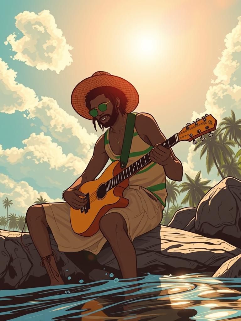 Lived-in groove, old porch jam, evening reflection by the sea, barefoot, unhurried