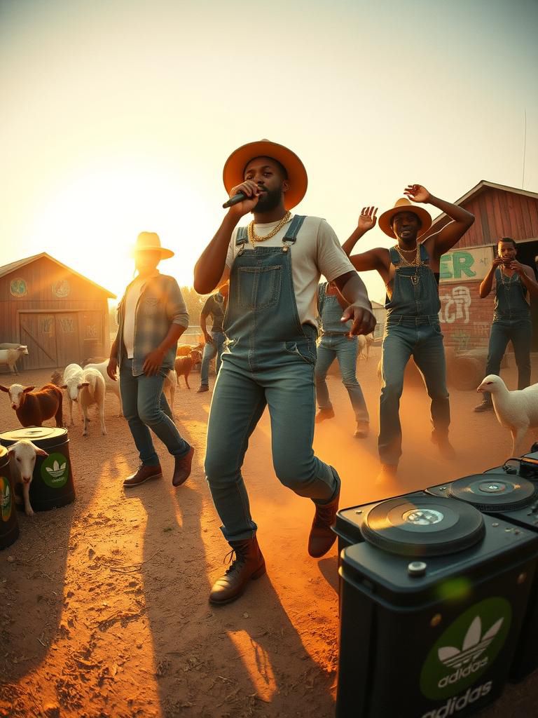 reggae riddim Jamaican patois, rural danceyard barnyard at golden sunset, wooden fences and hay bales, goats and cows nearby, chickens scatter as bass drop hit, hand-painted signboards instead of graffiti, old-school selectors on crate speakers, turntables set up on oil drums, farmers and youths in straw hats and boots, denim, overalls mixed with Adidas tracksuits, gold chains catch sun flare, mic in hand chanting call-and-response, expressive body language, dust rising from stomping feet, warm analog sunlight, fisheye lens style, film grain, raw yard energy, roots reggae pioneers aesthetic, early sound system culture vibe, crowd rocking shoulder to shoulder, vinyl spinning under open sky, plywood dance floors on dirt ground, authentic 80s reggae fashion, timeless countryyard swagger, saturated earth-tone color palette, dynamic composition, freeze-frame motion of dancers mid-skank, low-angle shots from ground level, exaggerated poses, dramatic sun flare, VHS texture overlay bass