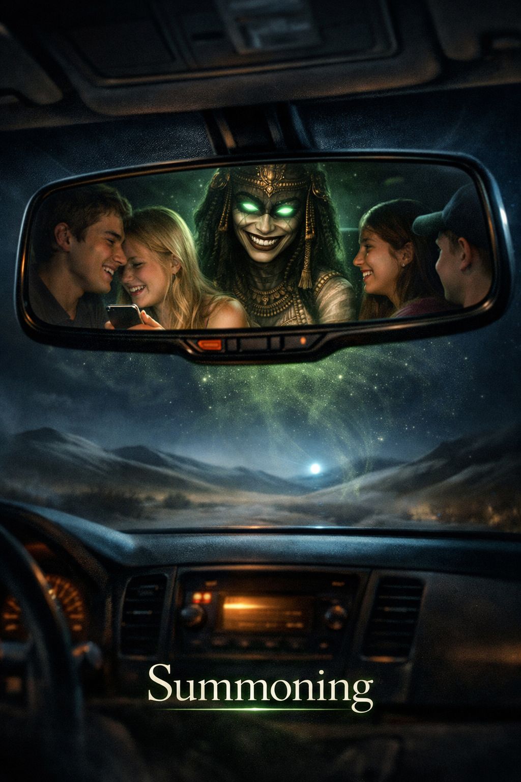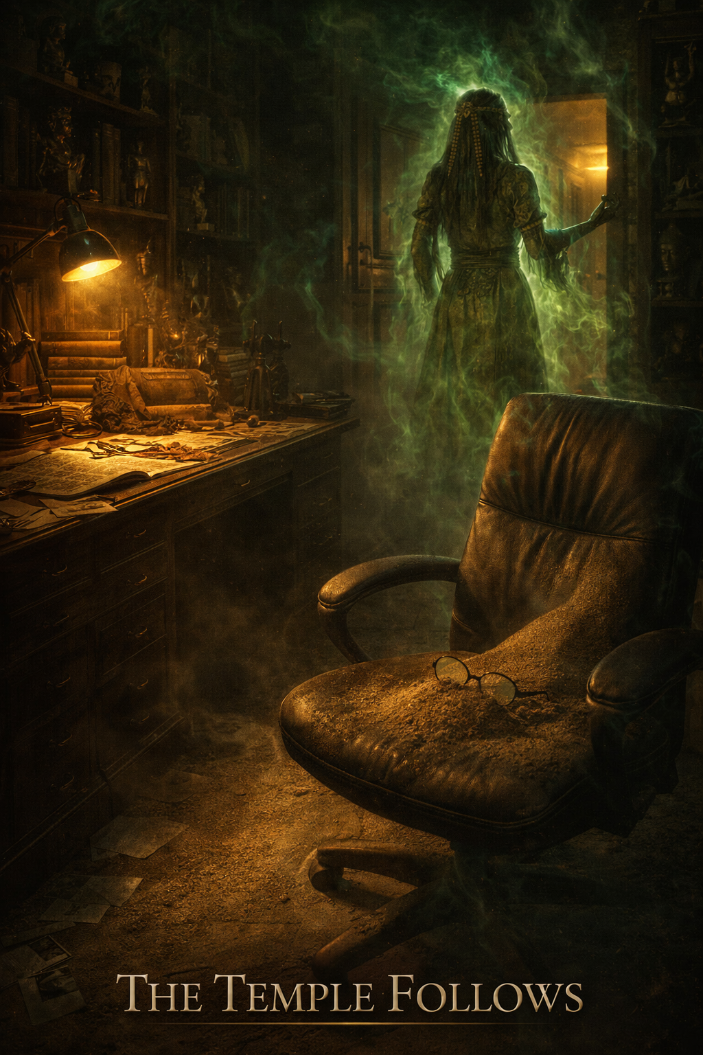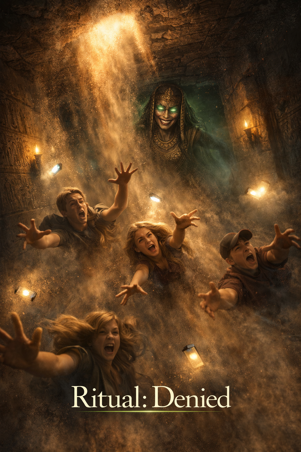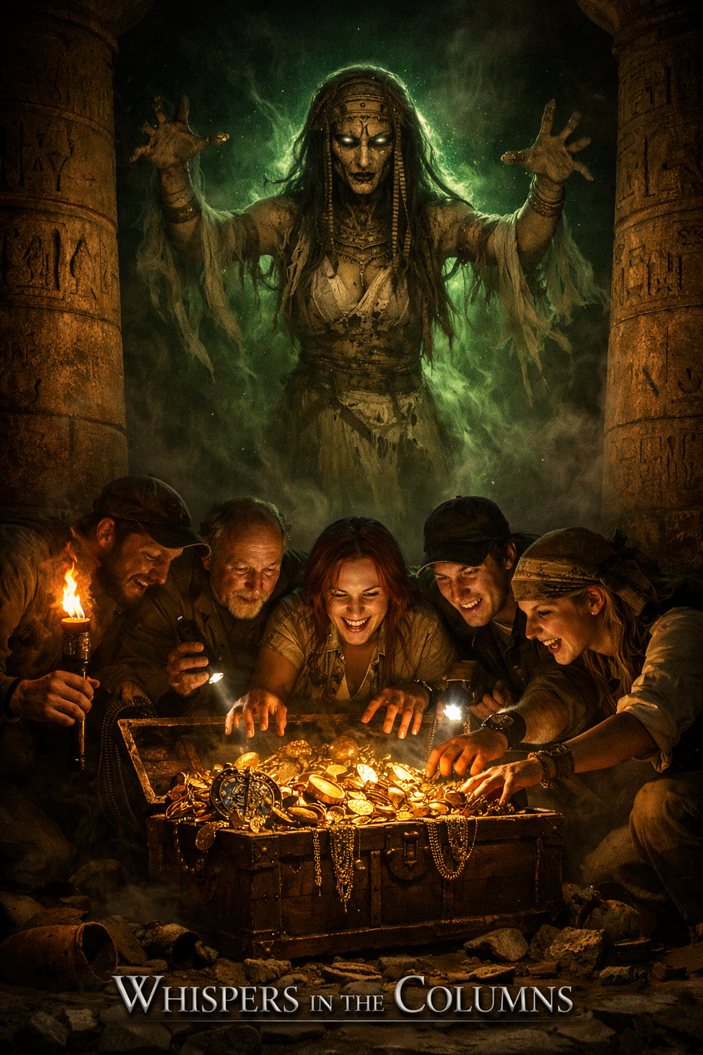 Female lead (haunting, possessed), ultra-dark PARANORMAL symphonic metal in an Ancient Egyptian tomb, 145 BPM, D minor, Phrygian/harmonic minor, Downtuned guitars, thick bass, double-kick, cinematic strings/brass, timpani, mixed choir for ritual chants; subtle ney/oud accents, Sound design: whispered voices panning, breathy ghost layers, distant wails, reversed reverb swells, low sub-drones, sudden âpoltergeistâ stingers, torch-flicker rhythmic tremolo, Verses: intimate/menacing (near-whisper), Choruses: huge, choral, dread-filled, Bridge: short spoken curse + choir (no long break), Solo max 8â12 bars, Intro <12s, Total length ~4:45 (max 5:00), Lyrics in English: greedy archaeologists break a seal; priestess-ghoul spirit rises, green glow, Anubis & Maâat weighing the heart;, âNo pop, âno rap, âno trap, âModern cinematic mix