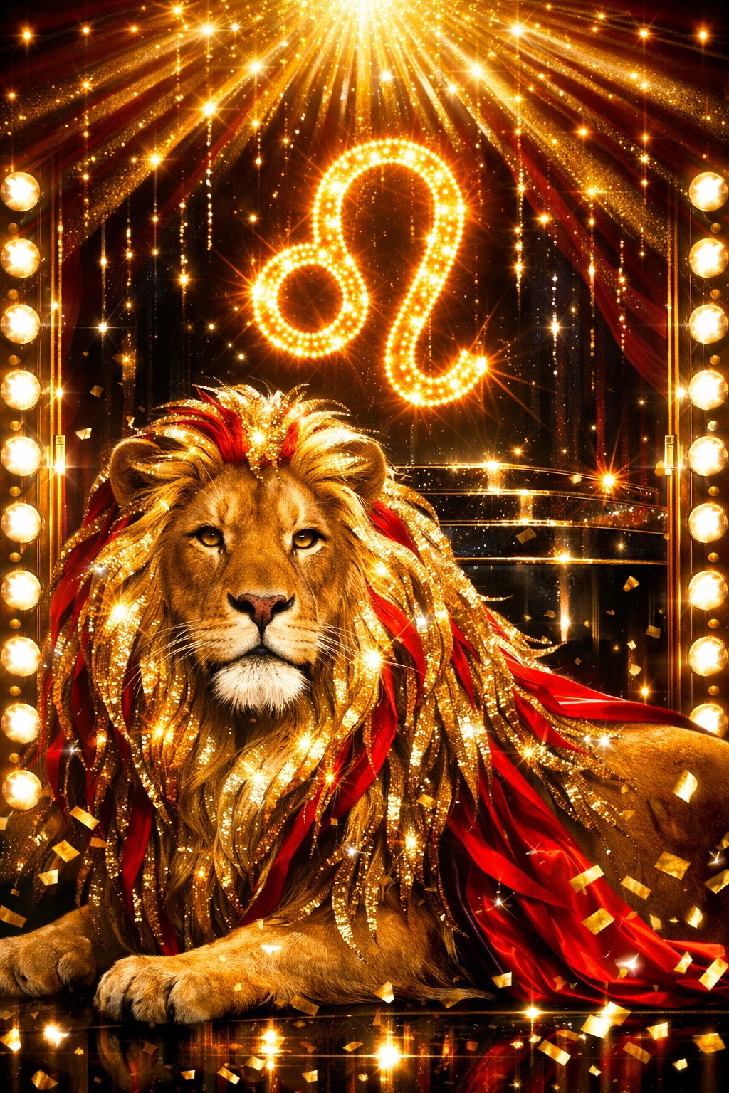 glam pop, 124 BPM, glittering synth brass, arpeggiated Juno synths, stuttered vocal chops, metallic snare hits, deep 808 sub-bass, jersey club kick pattern, glossy sidechain compression, wide stereo delay, plate reverb, neon club energy, feline swagger, zodiac persona, hyperpop glitch edits, runway anthem