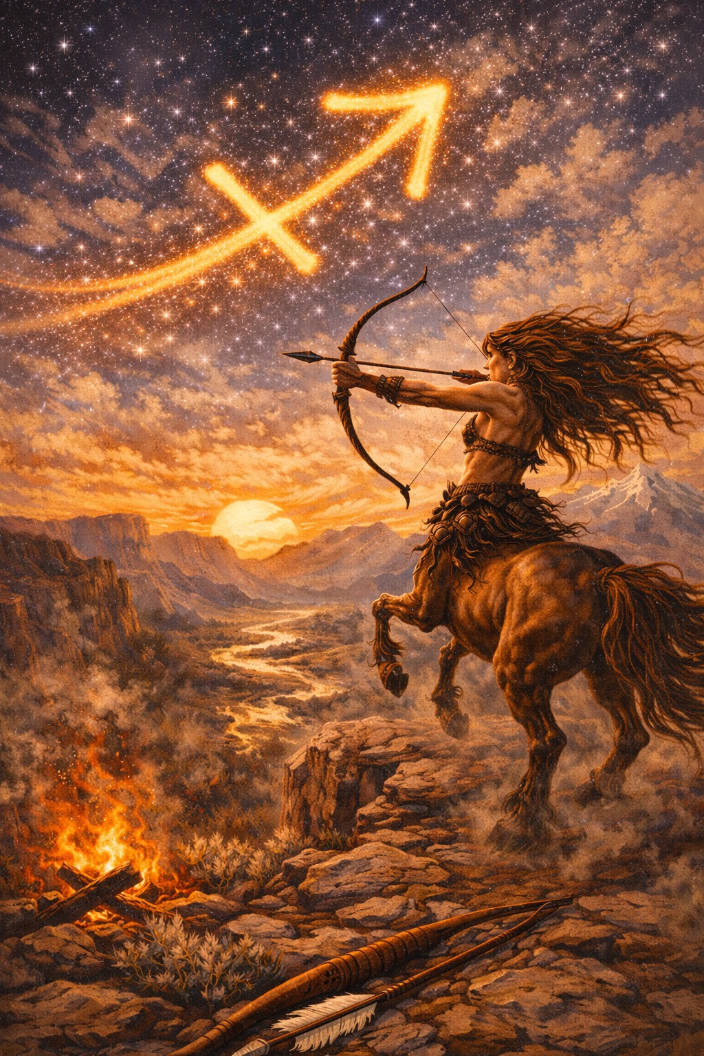 psychedelic folk rock, Sagittarius anthem, female belt vocals, acoustic guitar strumming, chiming electric guitar, mandolin tremolo, bandoneon drones, upright bass, brushed snare, tambourine accents, analog tape saturation, room mic ambience, stereo plate reverb, road trip swagger, fiery restlessness, 132 BPM, swung backbeat, chorus lift, sunset drift