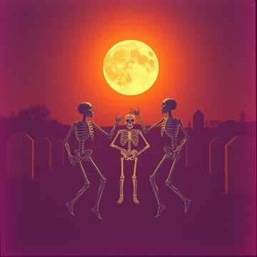 A fun, spooky Halloween song in the style of “Spooky Scary Skeletons” by Andrew Gold, Playful xylophones, upright bass, jazzy drums, and cartoonish ghostly sound effects, Male vocals with a mischievous, energetic tone, Tempo around 120 BPM