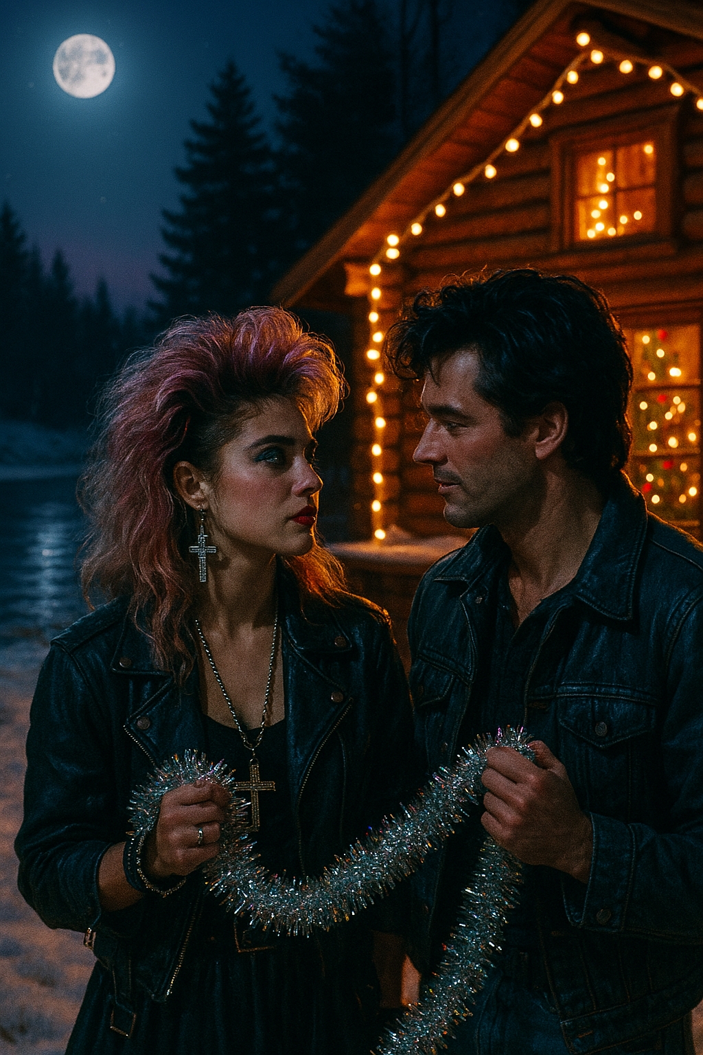 The 80s Christmas song launches with punchy electronic drums, intertwining tight arpeggiated synths and subtle robotic processing as female then male vocals alternate every two lines, The chorus bursts with lush analog pads, gated snares, and pulsing synth bass, A vocoder bridge transitions into a dense, celebratory 80s synth outro, Christmas vibes