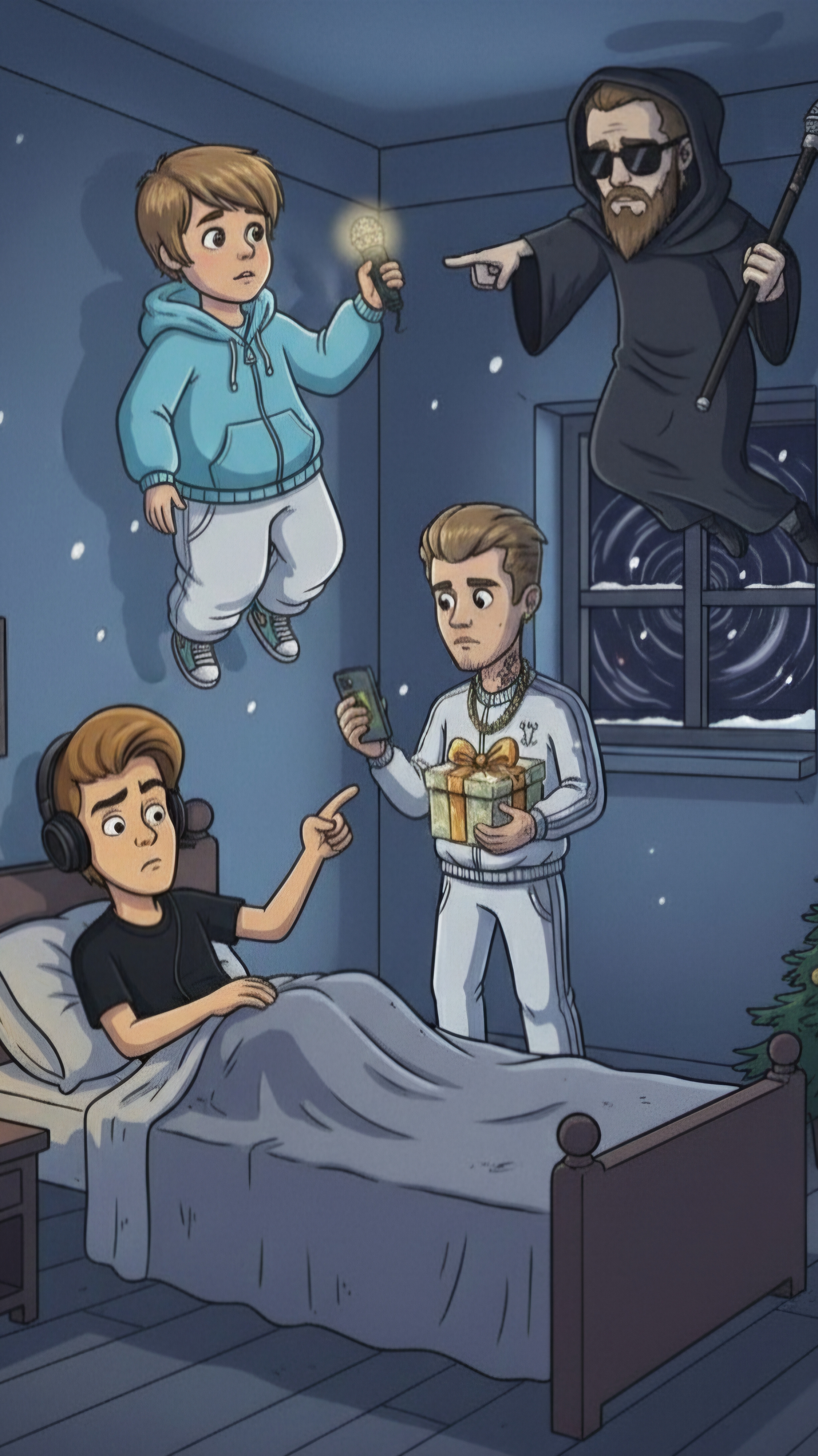 An early 90s Christmas rap explodes with a punchy 808 groove, sharp DJ scratching, and an electro-funk undertone, Three MCs trade quick, call-and-response verses, layered with sparkling synth stabs, Choruses pop with vocoded robotic hooks, chopped keys, thick slap bass, and glitchy synths, DJ-driven bridges amp up with wild scratches and swirling textures, sustaining an energetic, old-school vibe matched by futuristic vocoder flourishes each chorus