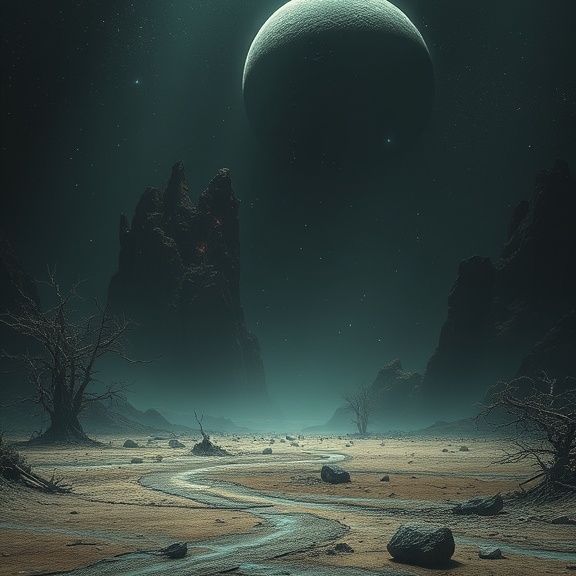 futuristic synth eerie atmospheric desolate slap acoustic guitar ambient rhythmic drums building tension intricate repeating riff otherworldly mysterious
