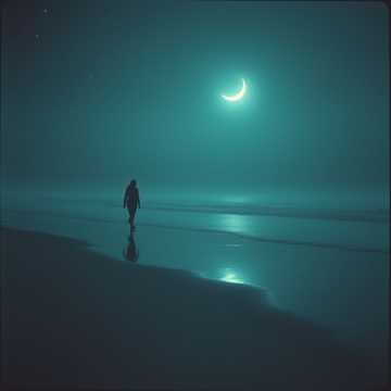 un kick profond et feutré, pas agressif mais régulier comme un cœur qui s’entête, une basse sombre et continue, presque subaquatique, des nappes synthétiques longues, opaques, brumeuses, qui évoquent l’onde noire du poème, des motifs mélodiques minimalistes en arpèges lointains, comme des éclats d’émotion qui percent à travers l’opacité, une progression lente, hypnotique, qui étire le temps comme la distance qui « s’étend et t’éloigne »