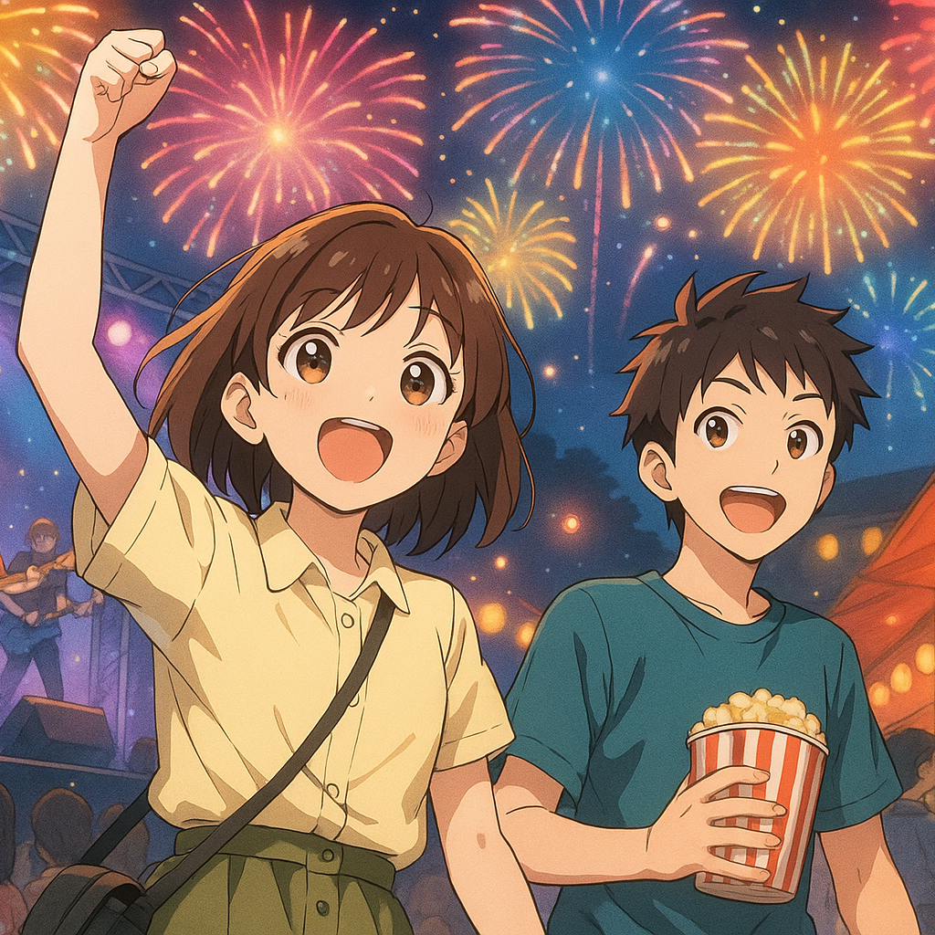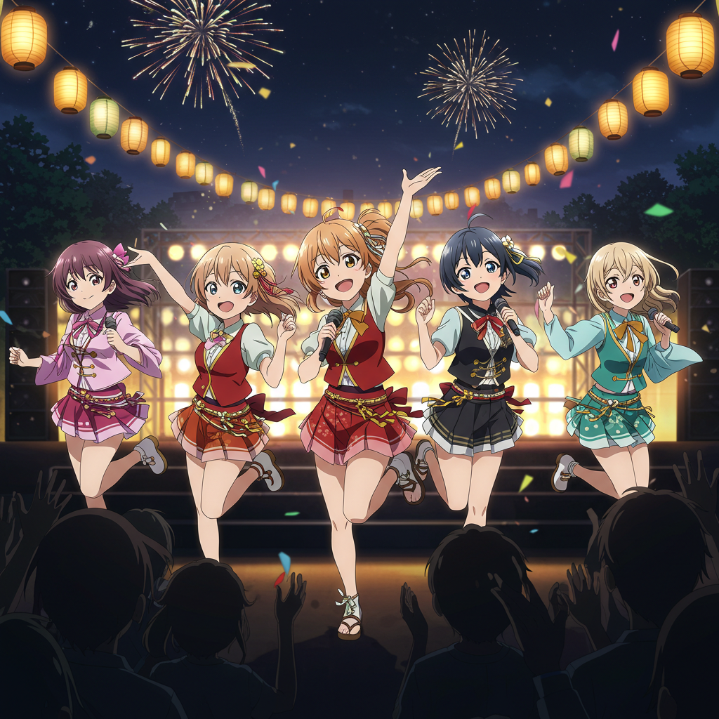 [Aesthetic: Summer festival, youthful love, dazzling night sky, live band feel]