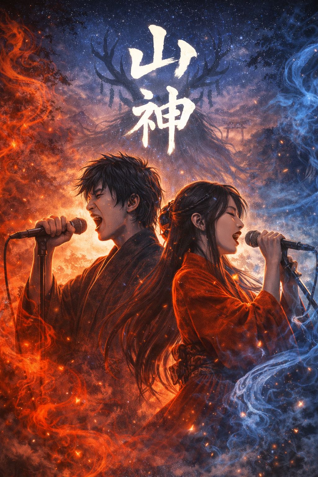 male and female vocal, Atmospheric Sacred Japanese Rock, Progressive Rock, Shinto-mysticism, Rock, Shachihoko-inspired, Gagaku instrumentation (Shakuhachi, Koto, Shamisen), Ethereal female vocals, Distorted electric guitar, Heavy drum beats, Staccato rhythm in chorus, Spiritual, Deep reverb, Dramatic, Tension-fille, Add epic choir harmonies: airy female choir for mystic tone, and mixed choir pads for mythic grandeur
