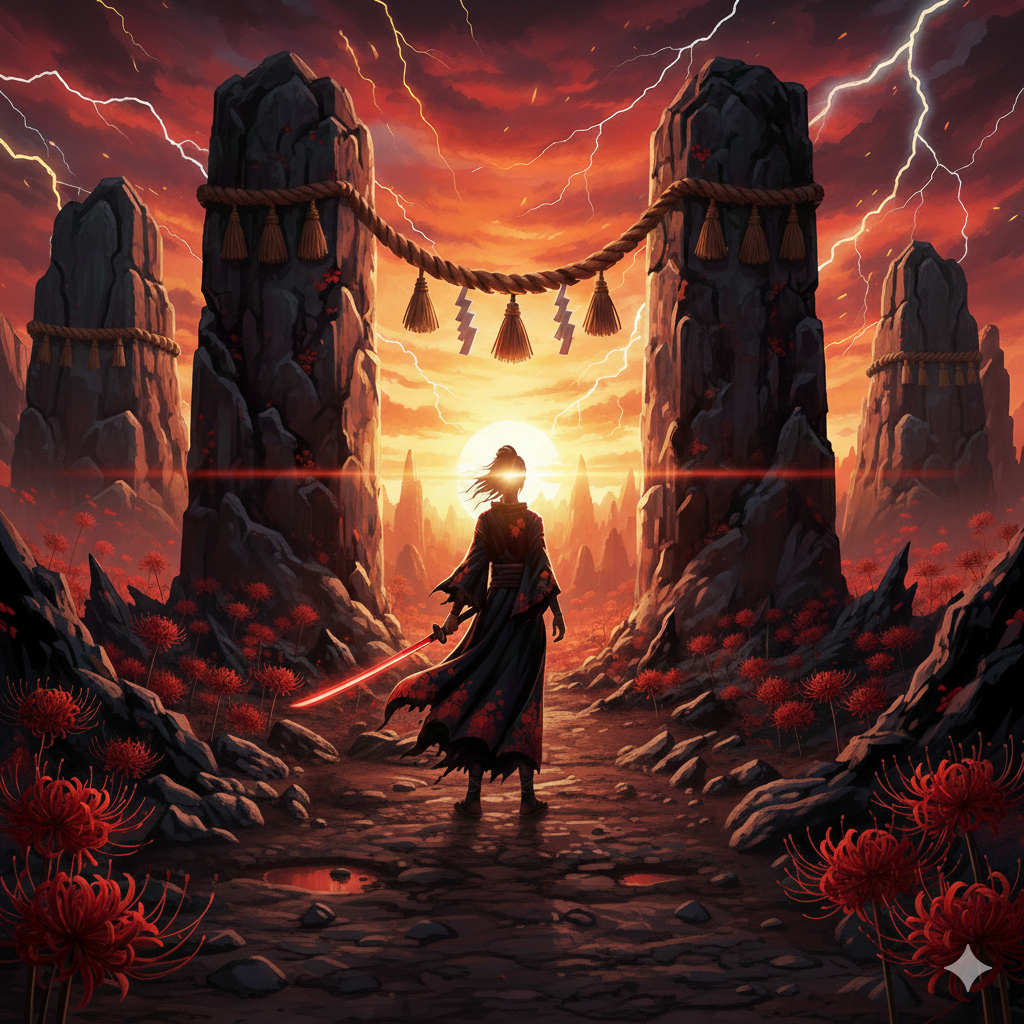 Aggressive Japanese rock with taiko-layered drums, detuned koto riffs, and overdriven guitars, Powerful female vocals, low and controlled in the verses, explode into a shout-along hook, Tempo rides a steady march that surges in the chorus; gang vocals and cymbal swells push the “border between worlds” theme, Mix leans on sharp transients and roomy toms for a mythic battlefield feel
