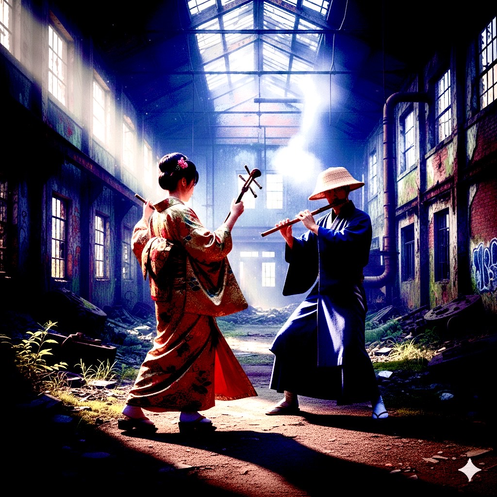 #sound design: Clean mix with traditional instrument spotlight, minimal electronic elements, gritty rock texture blended with Japanese acoustics