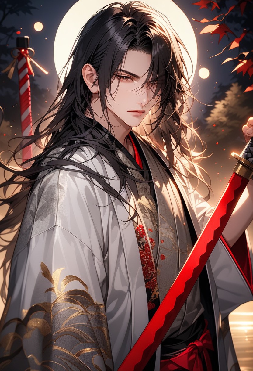 Epic Japanese-style visual kei rock without guitars, featuring shamisen, taiko, and shakuhachi, Fast tempo, dark, and cinematic, Emotional male vocals filled with passion and sorrow, The sound is dramatic and intense, blending traditional Japanese instruments with a mythical atmosphere, Themes of the moonlight, eight million gods, the cursed sword and the divine sword, demons, and purification, A tragic hero fights to purify his fate beneath the sacred moon, Powerful, mystical, and full of destiny