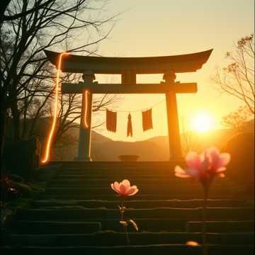 Uplifting Arena Rock, Japanese Shrine Prayer, Shinto, Fast-paced, 140 BPM, Massive Reverb, Driving Post-Punk revival, Mood: Hopeful, Epic, Soaring, Sacred, Elements: Prominent Synth Pads, Aethereal Sho pipes, Arpeggios, Driving Wadaiko drums, Dounaga daiko, shime daiko, Tshuzumi, Biwa Strumming, Driving Breathly Shakuhachi leads, Wide bleathly female vocal leads, Layered natural female Chorus, [Intro]Opening with powerful, reverb-soaked guitars and pulsing Shakuhachi, gradual energy increase