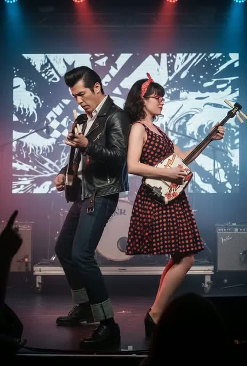 Live Concert, Japanese Traditional Instrument Performance, Rockabilly, Minor, 156BPM, Male Baritone Vocals, Live Shout Vocals, Master Shamisen (aggressive percussive picking, sharp metallic twang, rapid-fire melodic runs), Rhythm Shamisen (driving rockabilly backbeat, steady rhythmic strumming, punchy attack), Bass Tsugaru Shamisen (heavy low-end resonance, percussive string slapping, deep thumping bass lines), Master Koto (energetic tremolo, intricate fast-paced melodies, bright shimmering timbre), Koto played by striking with Bachi (sharp percussive impact, rhythmic wooden clatter, aggressive staccato), Koto played with Slide Technique (bluesy pitch bends, long glissando sweeps, haunting sustain), Shakuhachi (breathy overtones, dramatic flutter tonguing, sharp dynamic swells), Shinobue (high-pitched piercing trills, celebratory rapid ornamentation, festive melodies), Odaiko (thunderous deep booms, immense reverberation, earth-shaking rhythmic impact), Wadaiko (precise synchronized pa