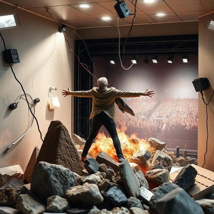 musical theater Act 1 closing number, raw alt-rock anthem building to arena meltdown, live concert energy — crowd noise audible throughout, male vocal starting controlled then escalating to unhinged, electric guitar distortion increasing as the song progresses, the band trying to keep up with a frontman going off-script, drums accelerating ahead of the click track, PA system feedback as emotional punctuation, crowd chanting between sections, 130 BPM accelerating to 155 by final chorus, E minor, brass stabs entering at the bridge — stolen from his own regime's sonic palette and turned against it, the sound of a man on mood stabilizers watching the medication fail in real time, inspired by Wrath Against the Machine "Killing in the Name" meets Greenish Day "American Idiot" meets a tent revival where the preacher starts speaking in tongues