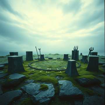 This celtic pagan metal track opens with downtuned guitars delivering crushing, palm-muted hooks atop grinding, forward bass, Tight frame drums drive each section with emphatic kick-snare accents and stomping toms, creating a ritualistic, march-like pulse, Verses feature deep spoken vocals, shifting in the chorus to powerful chant-style refrains, doom-inspired drones subtly layer under the raw guitars, infusing an ancestral tone, Breakdowns punctuate the structure with half-time, chug-driven riffs, leaving room for head-banging energy, The sound remains gritty, direct, and rhythmically unyielding, tailored for crowd movement and memorable live moments