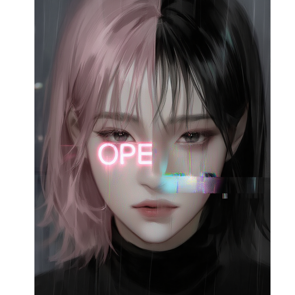A-minor Progressive FutureBass × industrial hyperpop hybrid with shimmering hypnotic synth layers, ethereal piano intro, pulsating reese bass, atmospheric pads, tight sidechain compression, glitchy percussive edits, bright transient kicks, reverse cymbal swells, chopped vocal textures, Dual vocals: one breathy ASMR kawaii soprano (whispery, floating), one cheeky autotuned rapper (bouncy, sassy, fast-flowing), Track arc: gentle intro → rhythmic hook → contemplative verse → rising pre-chorus → emotional chorus → re-hook with distorted rhythmic energy → final climax with layered harmonies → outro fading to lonely piano echoes