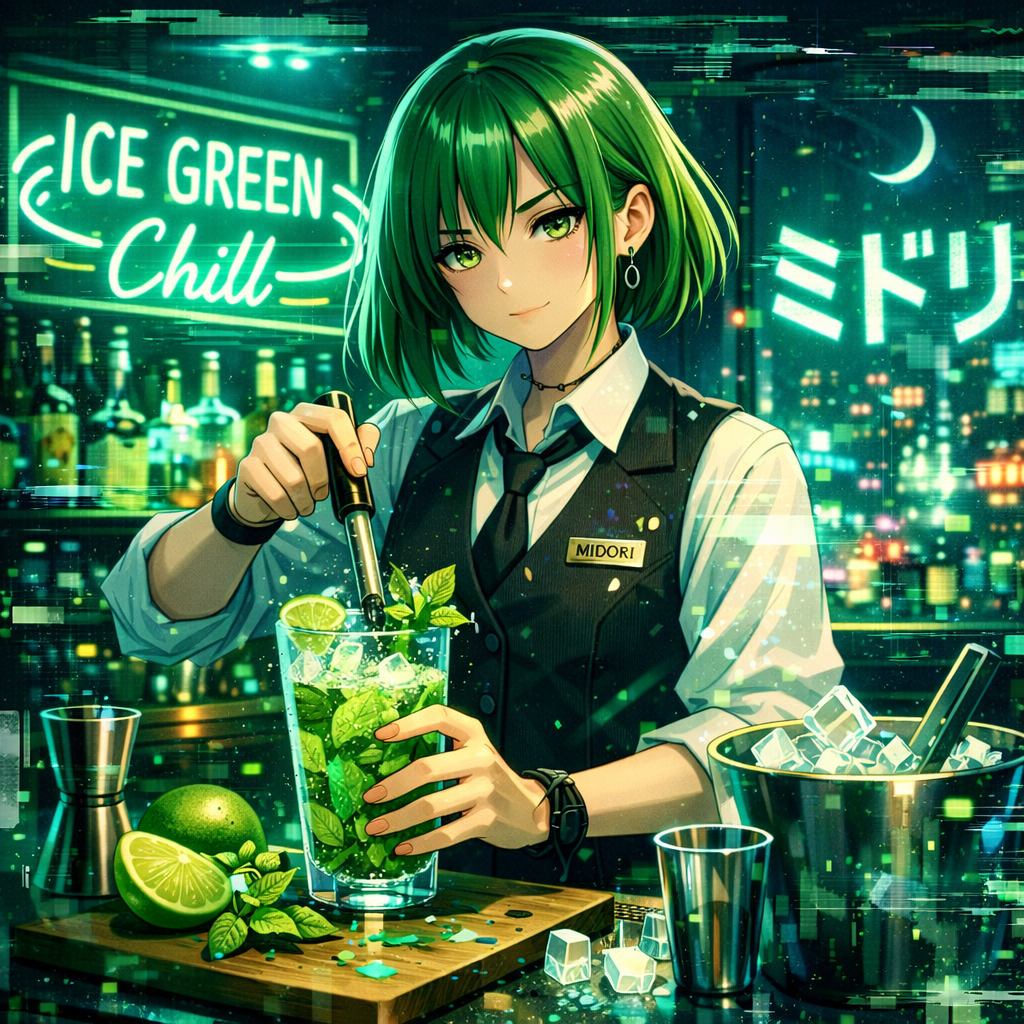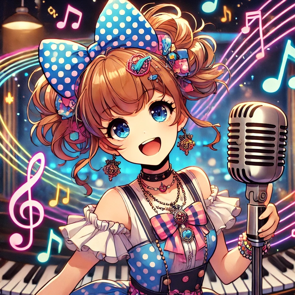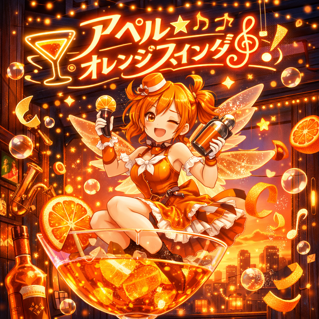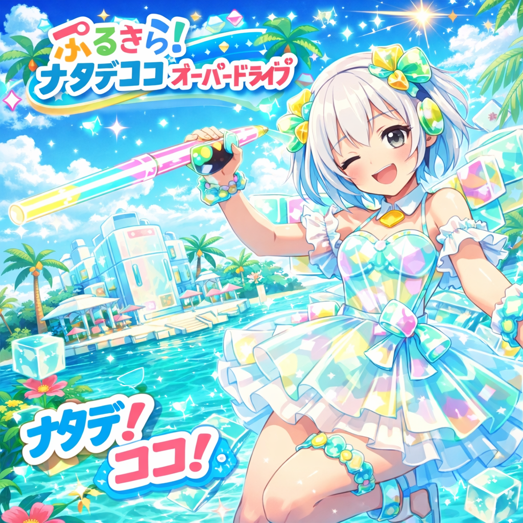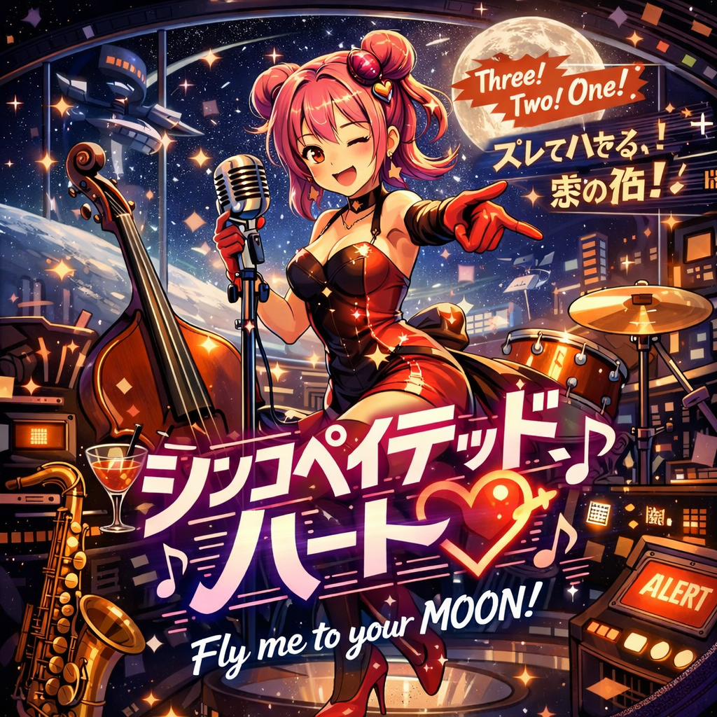A quirky Denpa song layered over a Bossa Nova groove: bouncy, syncopated electric piano and nylon-string guitar provide a breezy rhythm, while bright synths and playful melodies create a kaleidoscopic texture, Hyperactive percussion, swingy bass, and charismatic group vocals energize each section