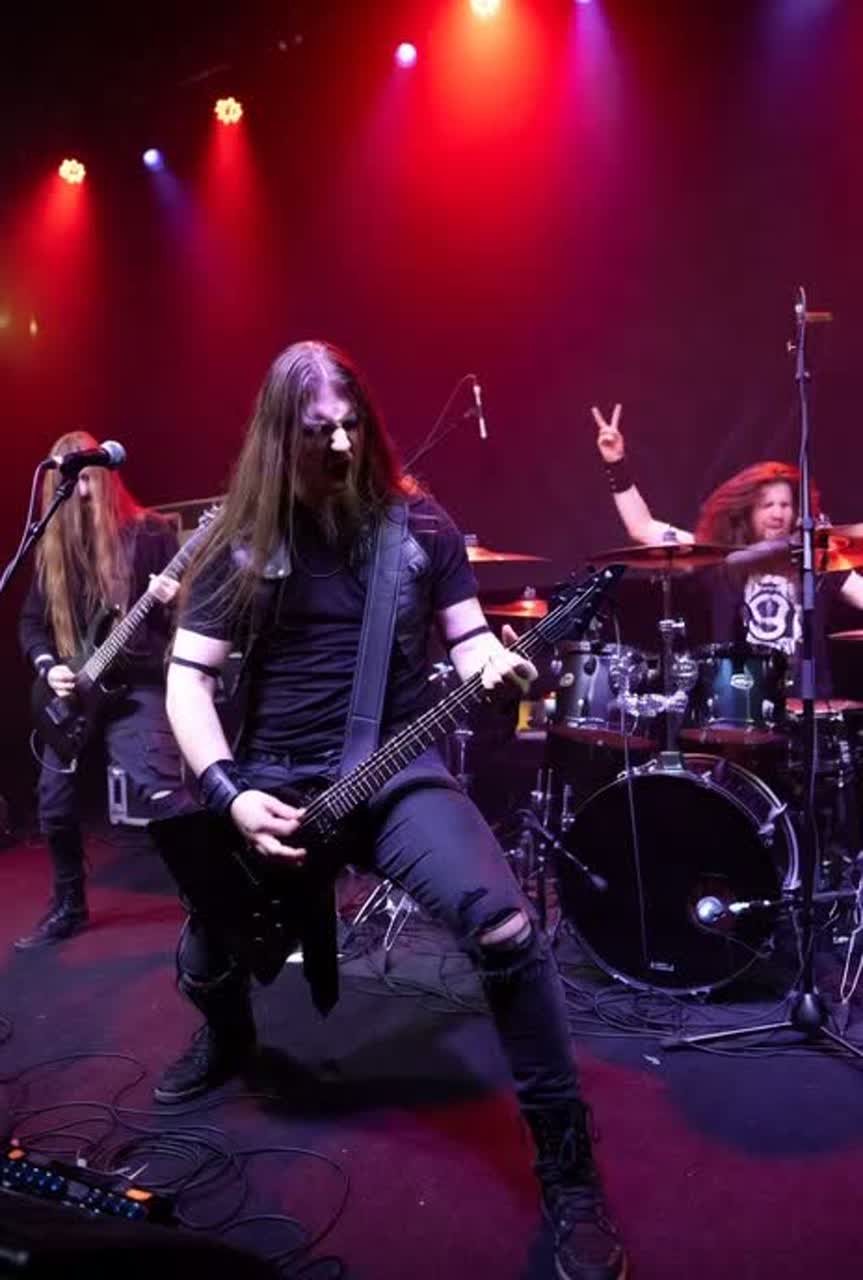 Haunting, violent, deeply dark Scandinavian/Viking black metal with Viking overtones, primal anxiety, tribal percussion, ambient horns, frostbitten riffs, rhythmic rock guitar bass, expressive warlike drums, and a male vocalist with a low gritty voice like a battle-worn Viking warrior, Vary chords with augmented and suspended chord variations to make room for the lead guitar to live