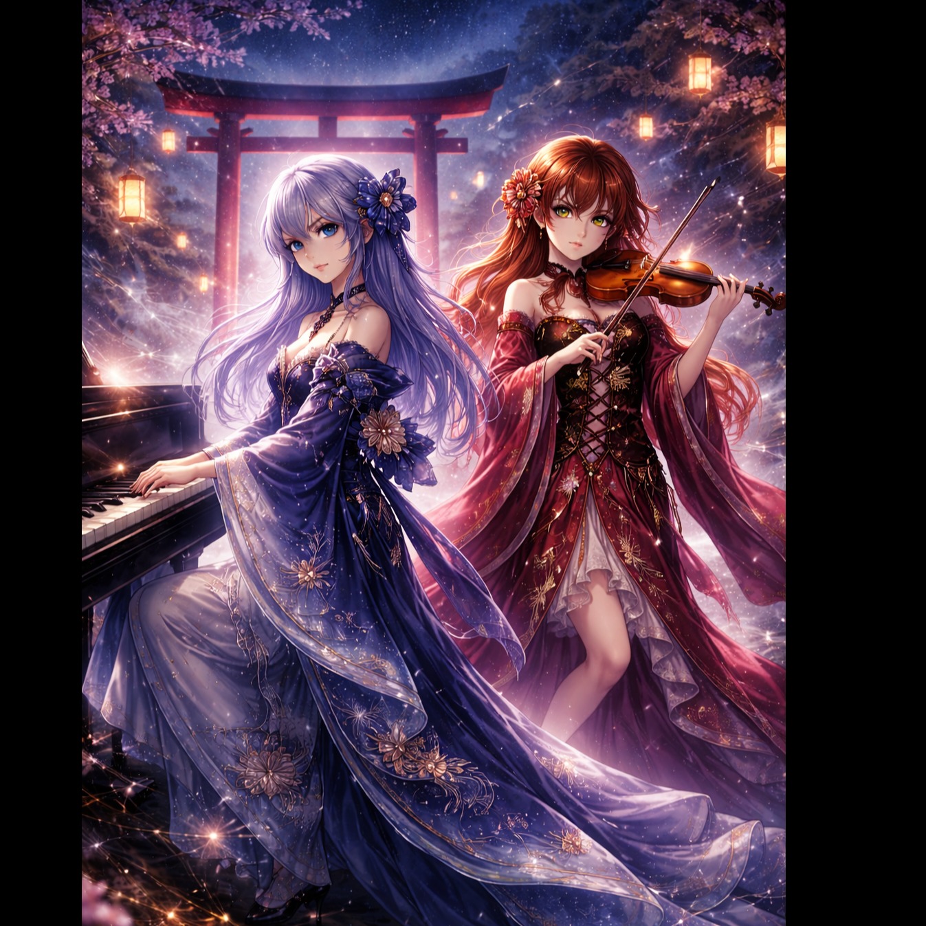 Piano and violin concerto, music of the new era, exciting from start to finish, melodic, powerful kick drums, techno, Intense performance, Passionate Feelings