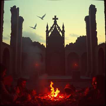 terrfaing ritual track, woods of ypres vibe, This dark dubstep track fuses sparse, brooding acoustic guitar and, clean vocals in the verses, layered with subtle, swelling choral textures, Choruses explode with crushing harmonized guitars, thunderous drums, huge vocal harmonies, and shadowy dark-reggae grooves, dark and epic bit, chosruses epupt with powerful hevy ancient drums
