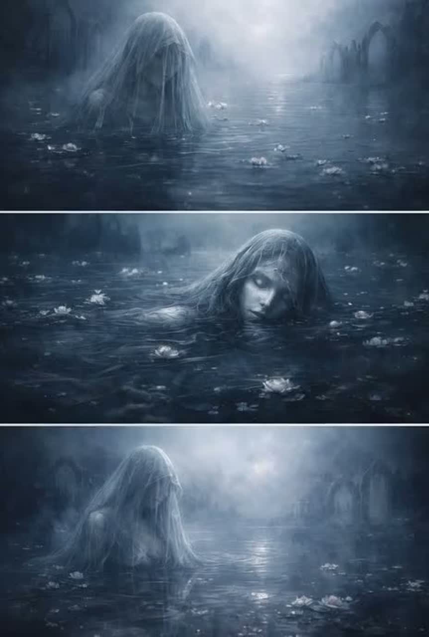 Haunting Piano Ballad — slow, echoing piano chords ripple outward like water, wrapped in airy reverb that makes every note feel suspended, The female vocal leads with fragile sorrow, soaring at moments like a cry across the water, Male harmonies drift in and out, faint and ghostlike, fading like ripples that never quite reach the shore, The mood is mournful, ethereal, and reverent — a devotion drowned, remembered only in echoes
