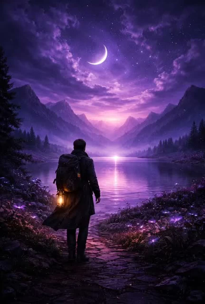A lone traveler steps into a world where the sun has set forever, The sky is painted in endless violet — neither night nor day, but the threshold between them, His voice is deep and echoing, like someone singing to the very edge of existence, Each note feels like a footstep across worlds, grief and wonder intertwined like shadows touching light, Tone: