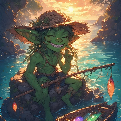 Goblin, Playful, Curious, Ocean-inspired, Relaxed mid-slow tempo, Soft marimba, xylophone, congas, splash cymbal, triangle, water droplet, Steel drum, upright bass, harp, glassy synths