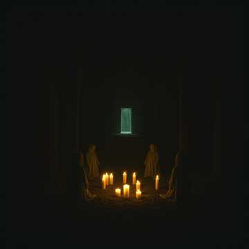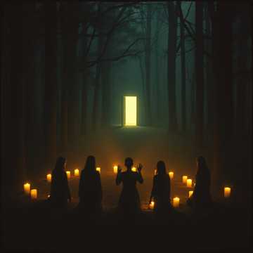 Ethereal dark folk, haunting harmonies, acoustic guitar, atmospheric synth pads, slowly building percussion, hypnotic, slightly unnerving, male and female duet vocals, cult chanting