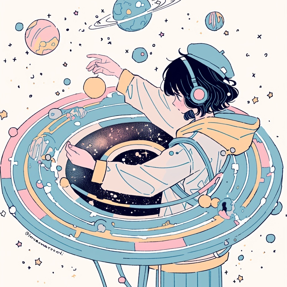 Japanese lyrics, kawaii lofi digital pop with whisper female voice, dreamy and playful atmosphere, chill hip hop beat, soft lo-fi textures, sparkly synths, light percussion, floating and cosmic mood, relaxed tempo, kawaii and mysterious vibe