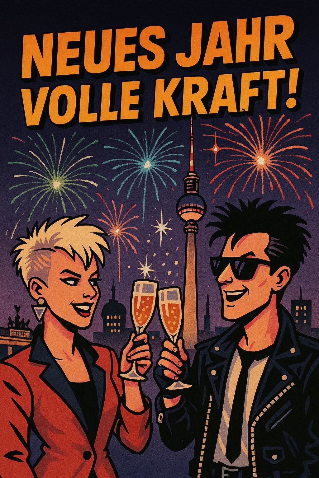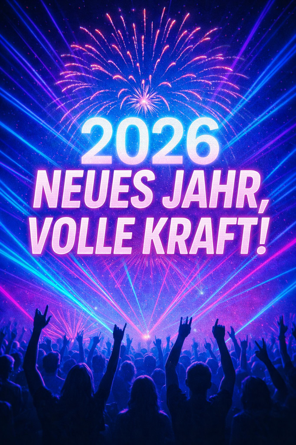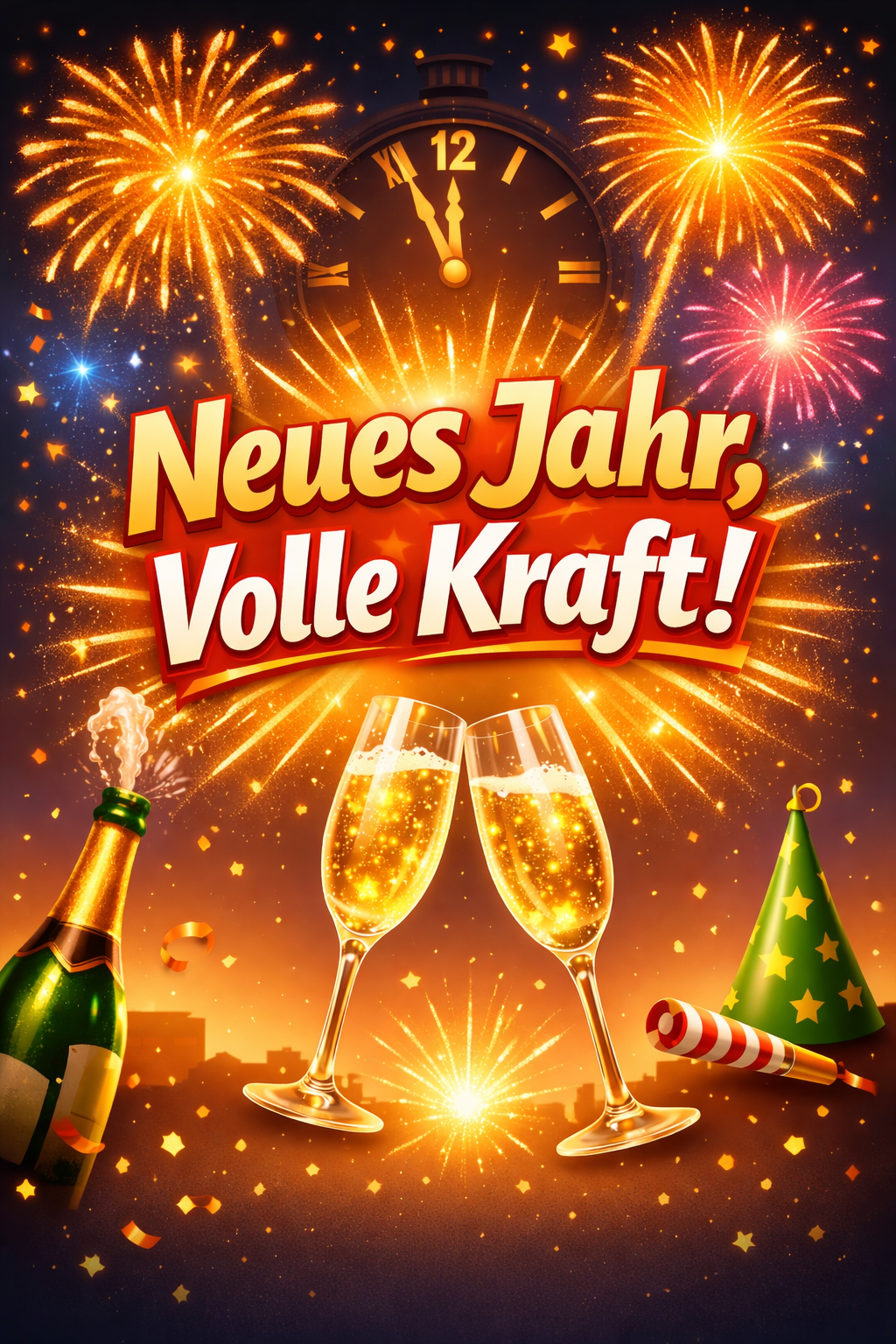 Emphasize group shouts on "(Neues Jahr!)" and "(Volle Kraft!)"