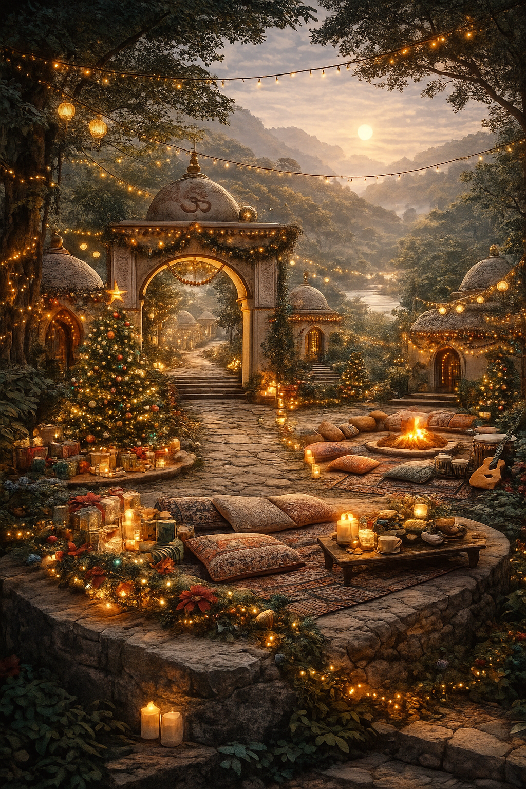 A long, meditative instrumental opening with gentle acoustic guitars, classic 60s electric bass, and warm organ, Tamboura and sitar weave a dreamy Indian texture, with tabla rhythms softly supporting an ASMR-like calm, Subtle sleigh bells and celesta nod to Christmas, blending with flutes and chimes, Each section evolves fluidly, layering melodies and textures while maintaining a tranquil, reflective mood