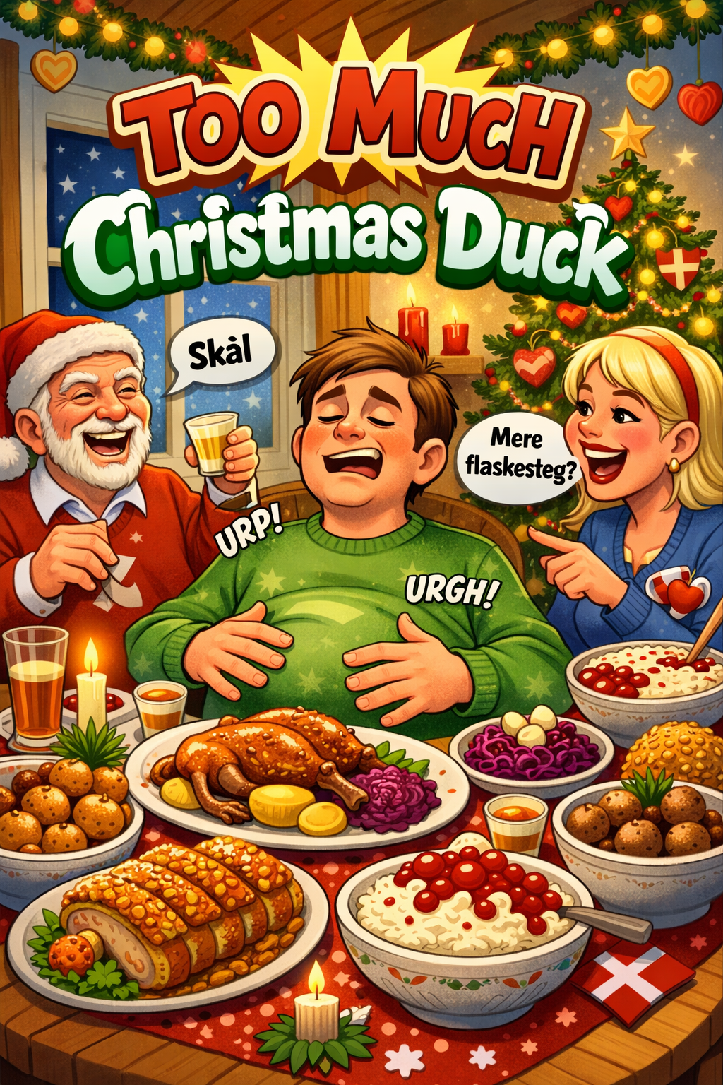 This eurodance track powers in with pulsing synth bass, crisp hi-hats, and bright stabs, Playful bells and chimes invoke holiday vibes, The verses bounce over a 4-on-the-floor beat, building to an irresistibly catchy, anthemic hook, Comical background moans and groans, panned wide, add quirky humor as layers stack, keeping the mood upbeat and festive throughout