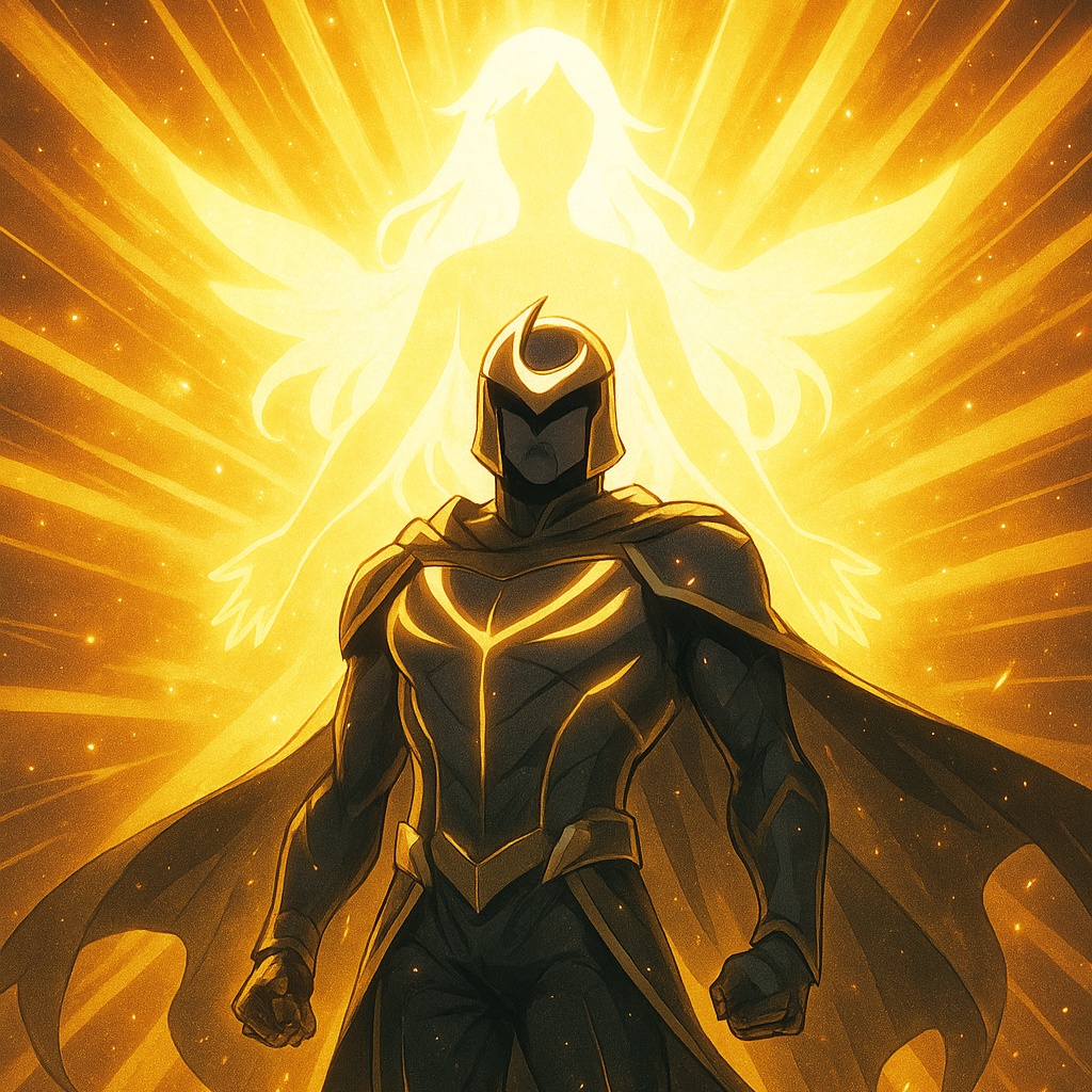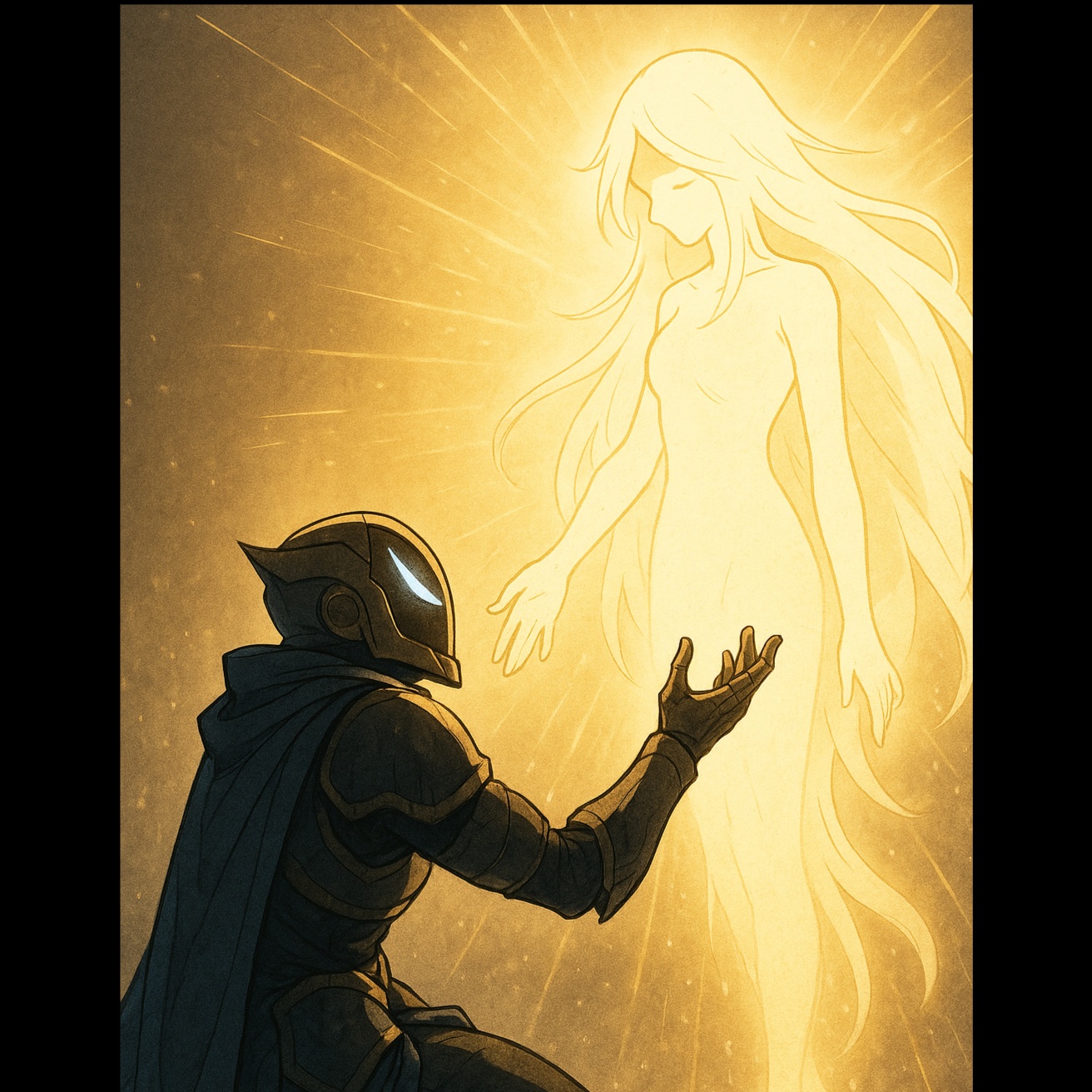 Male spoken vocals, low and broken, unified voice, radiant and layered, Cinematic score with soft strings, celestial pads, and rising light motifs, Slow, emotional