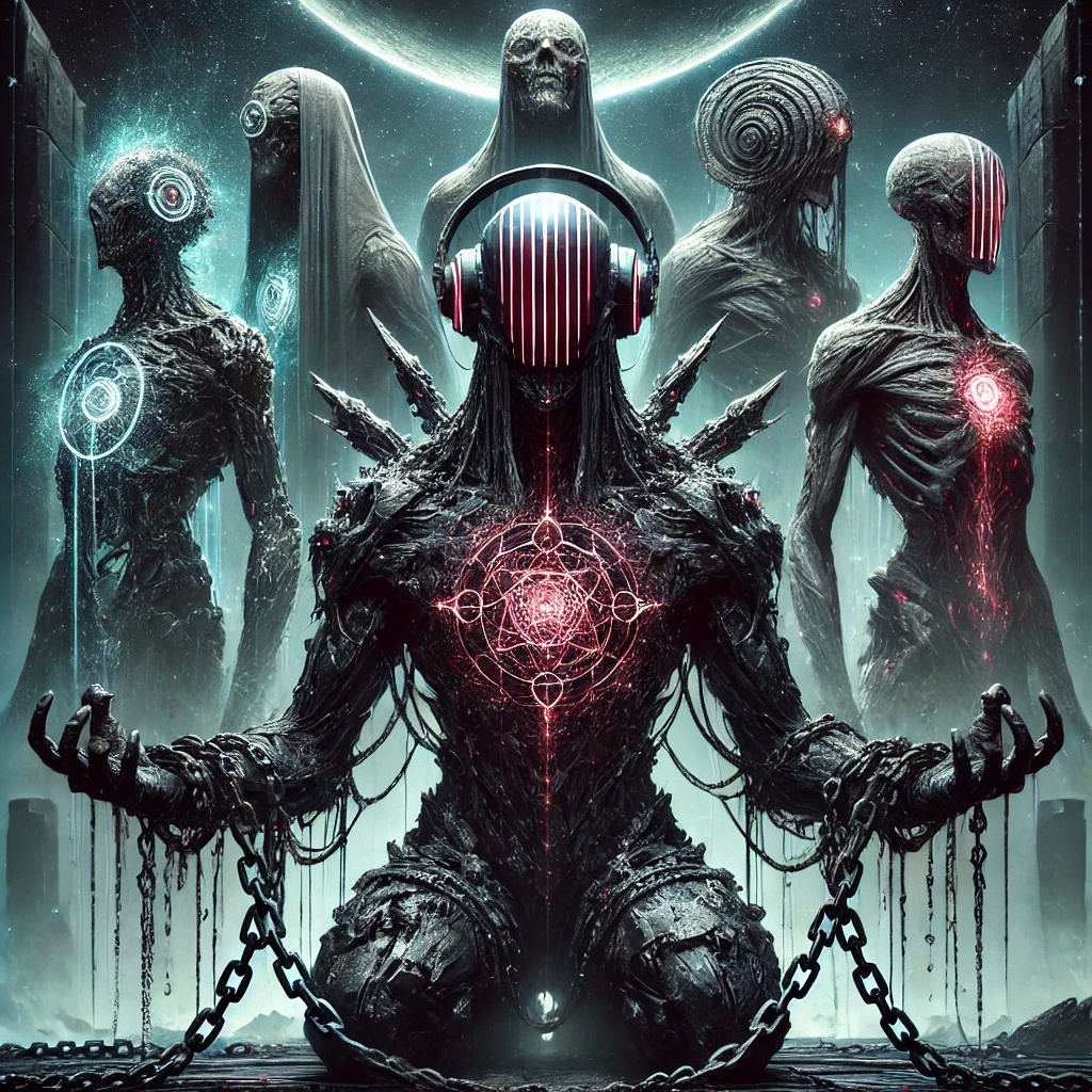 Fractured dimensional ambience, reality-warping distortion, non-linear pulse rhythms, glitched harmonic dissonance, collapsing synth drones, shifting tonal geometry, broken atmospheric layering, cosmic horror undertones, ancient mechanical resonance, static-laced silence, deep alien textures, haunting reverb stutters, surreal, mind-eroding, incomprehensible sound structure