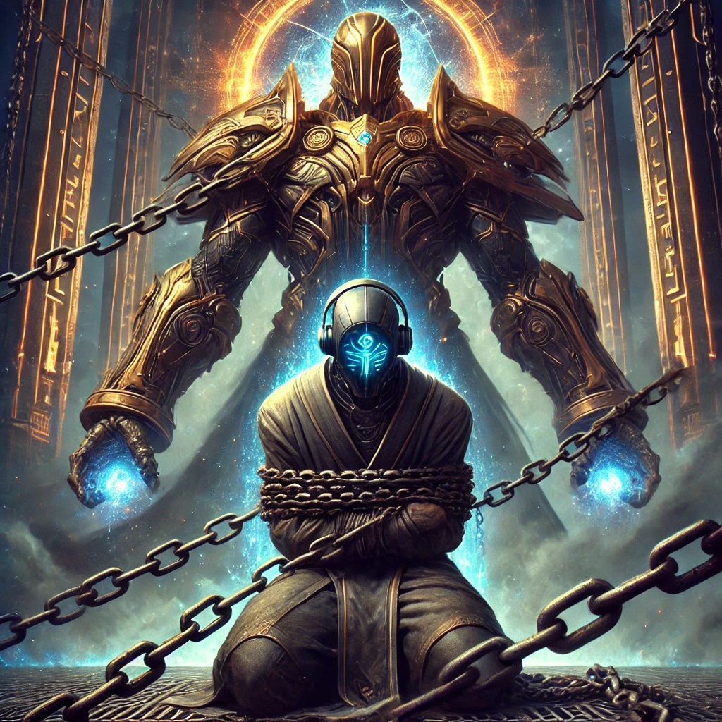 Majestic orchestral, divine war march, Fast and commanding rhythms, deep choirs, shimmering strings, grand yet oppressive atmosphere, regal spoken-word narration, oppressive inevitability