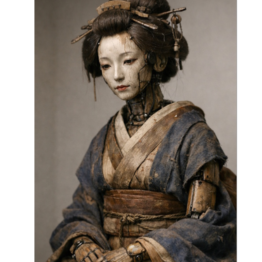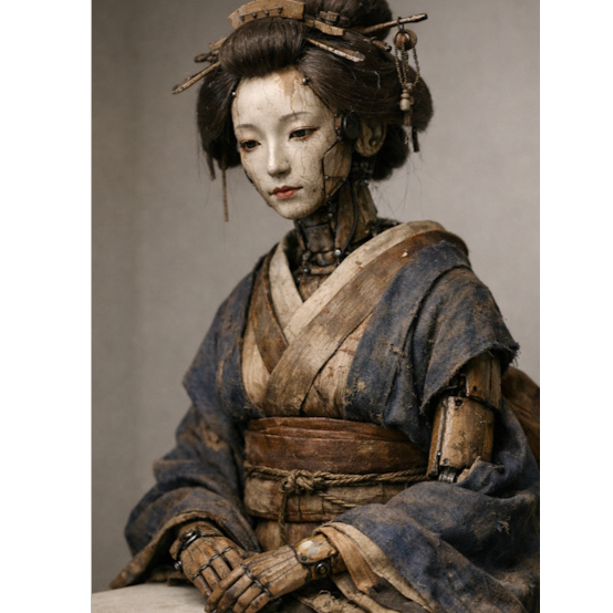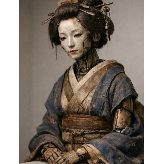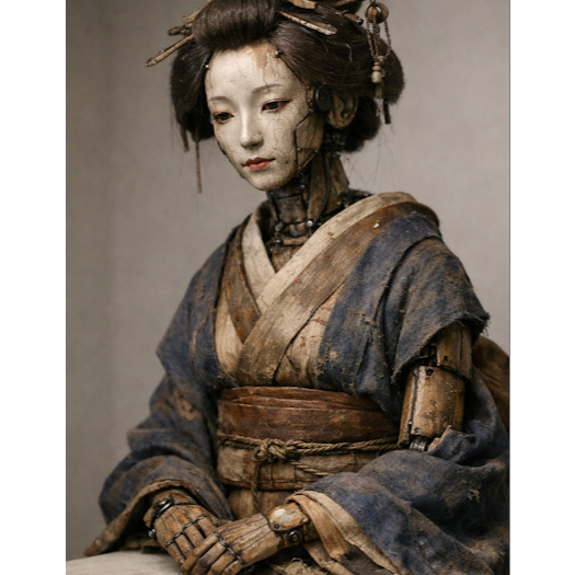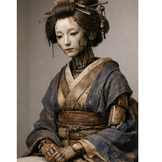 Breath-controlled shakuhachi tones, smooth but slightly artificial phrasing, controlled and polished attacks, moments of stiffness followed by soft decay, cool and detached atmosphere, gradual melting of structure, elongated fading notes, fragile beauty with an artificial aftertaste