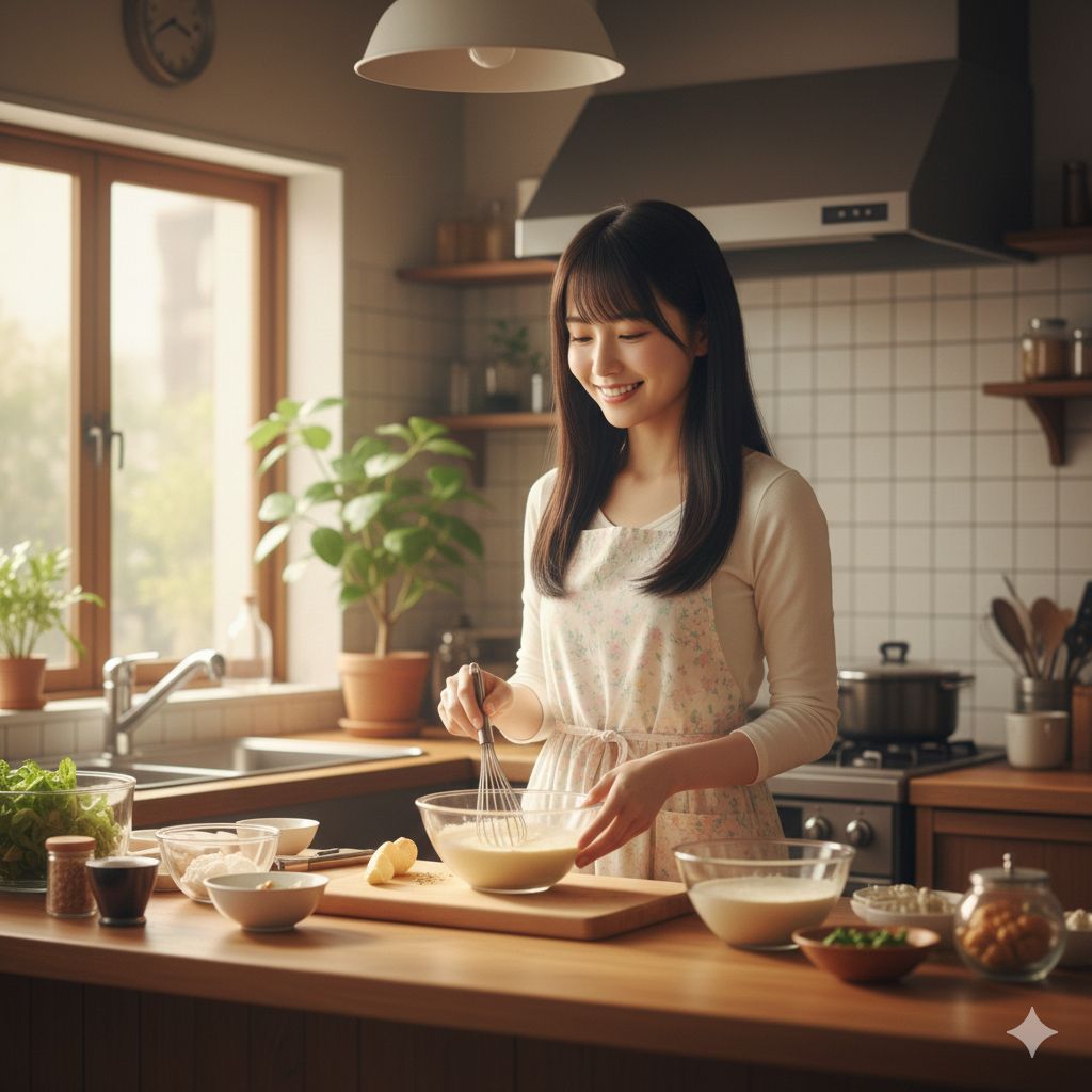 A calm, heartwarming and cute song sung by a young wife in soft Mie-dialect Japanese, The theme is a loving daily life where the wife cooks breakfast, lunch, and dinner for her husband, The mood is gentle morning sunlight, a quiet kitchen, warm love, and domestic happiness, Use a delicate, youthful female vocal with a tender and slightly shy tone, Arrangement features violin, cello, contrabass, glockenspiel, xylophone, timpani, and taishogoto (Japanese zither), Soft, cozy, lightly rhythmic, with a sweet and innocent atmosphere, Warm acoustic texture, gentle strings, sparkling bells, and a lyrical storytelling style