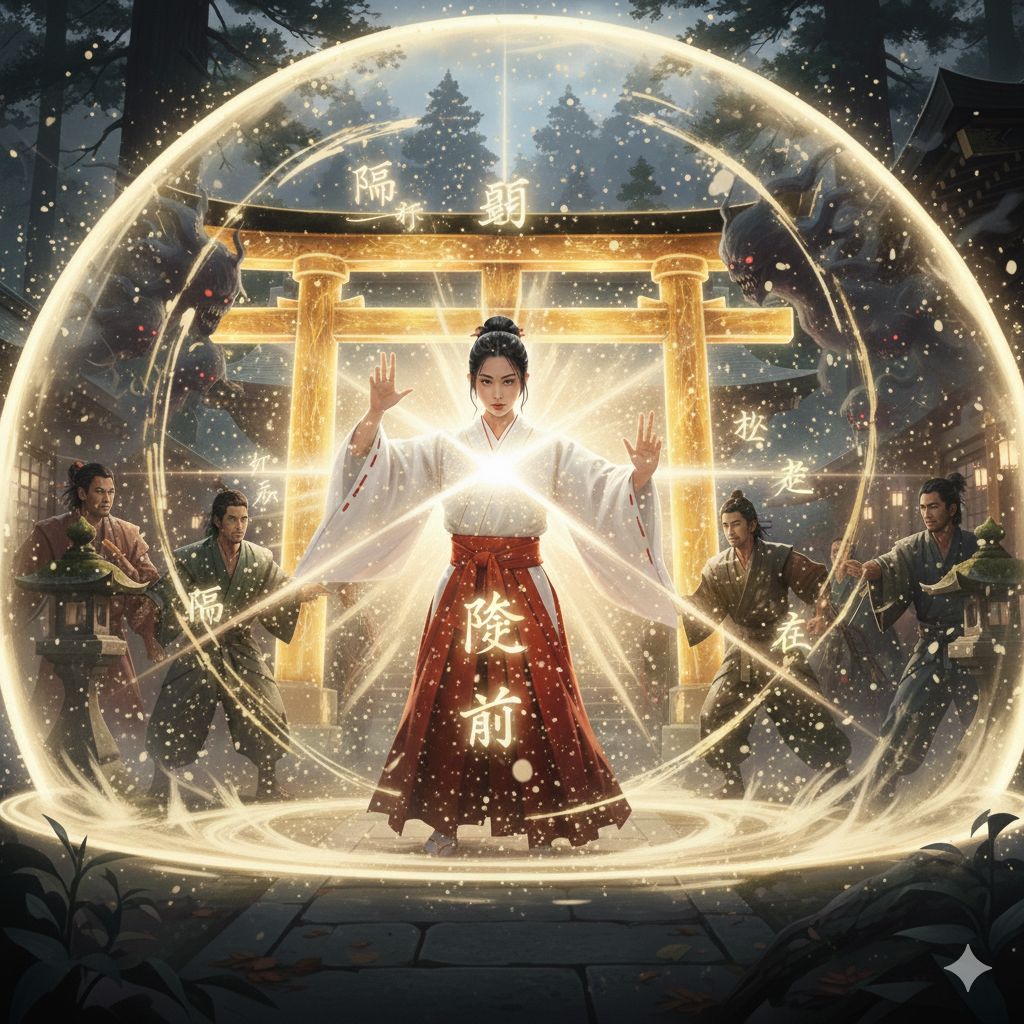 Create a fast-activation protective song that feels like a sonic barrier turning on instantly, The mood is tense → then immediately safe, as if a protective light circle appears the moment the song begins, Use traditional Japanese instruments: taiko, suzu (small bells), shinobue, low ritual drums, and metal percussion with sharp, clean strikes, The vocal is a calm but commanding female voice, slow and deliberate, sounding like an ancient guardian, He is not chanting a spell, but speaking powerful syllables as “sound keys” that activate protection, Use strong percussive sound cues, like a Taiko “DON!” at the beginning, and shimmering bells for activation, The tempo should be steady, atmospheric, slightly dark but empowering, never frightening, Include emphasized sound-key syllables: