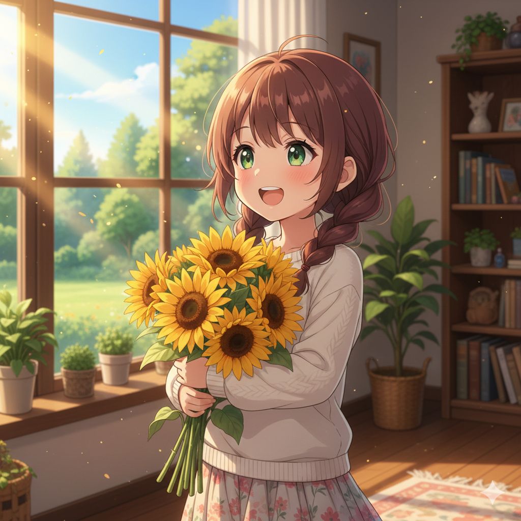 "A cheerful young female singer with a bright, cute, and bouncy voice, singing a happy morning song, Instruments: glockenspiel for sparkling highlights, triangle for twinkling light, handbells for angelic brightness, xylophone for playful rhythmic jumps, timpani for dynamic moments in the chorus, and flute for a soft flowing melody, Upbeat tempo (BPM 125) with light staccato notes, playful and lively energy, The music should evoke sunlight streaming through a room, the feeling of moving with the light, like a sunflower turning toward the sun, The vocals are joyful, lively, and slightly airy, conveying a sense of morning happiness, excitement, and warmth, without sounding childish, "